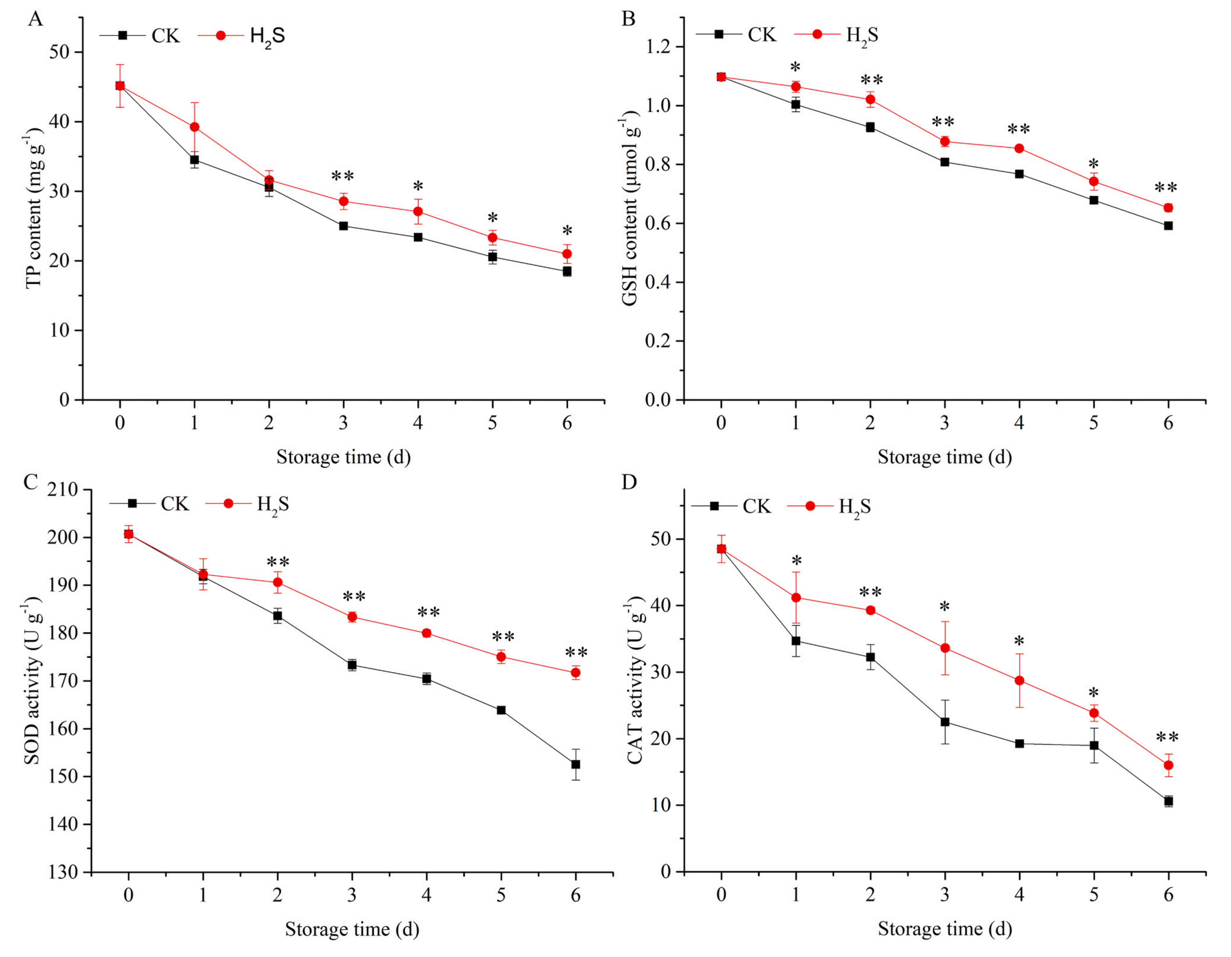 在CK和H2S處理組中,TP含量均隨貯藏時間的延長而下降。H2S處理減緩了TP含量的下降,且從第3 d開始出現(xiàn)顯著差異,說明H2S起到了阻斷蛋白的作用。H2S還改變了黃花菜的抗氧化系統(tǒng)。在整個貯藏期內,H2S處理組采后黃花菜GSH含量顯著高于CK組。黃花菜SOD活性呈下降趨勢,而H2S在第2 d開始顯著緩解了這種下降趨勢,維持在高于CK組的水平。CAT活動結果表明,H2S處理組CAT活性活性顯著高于對照。