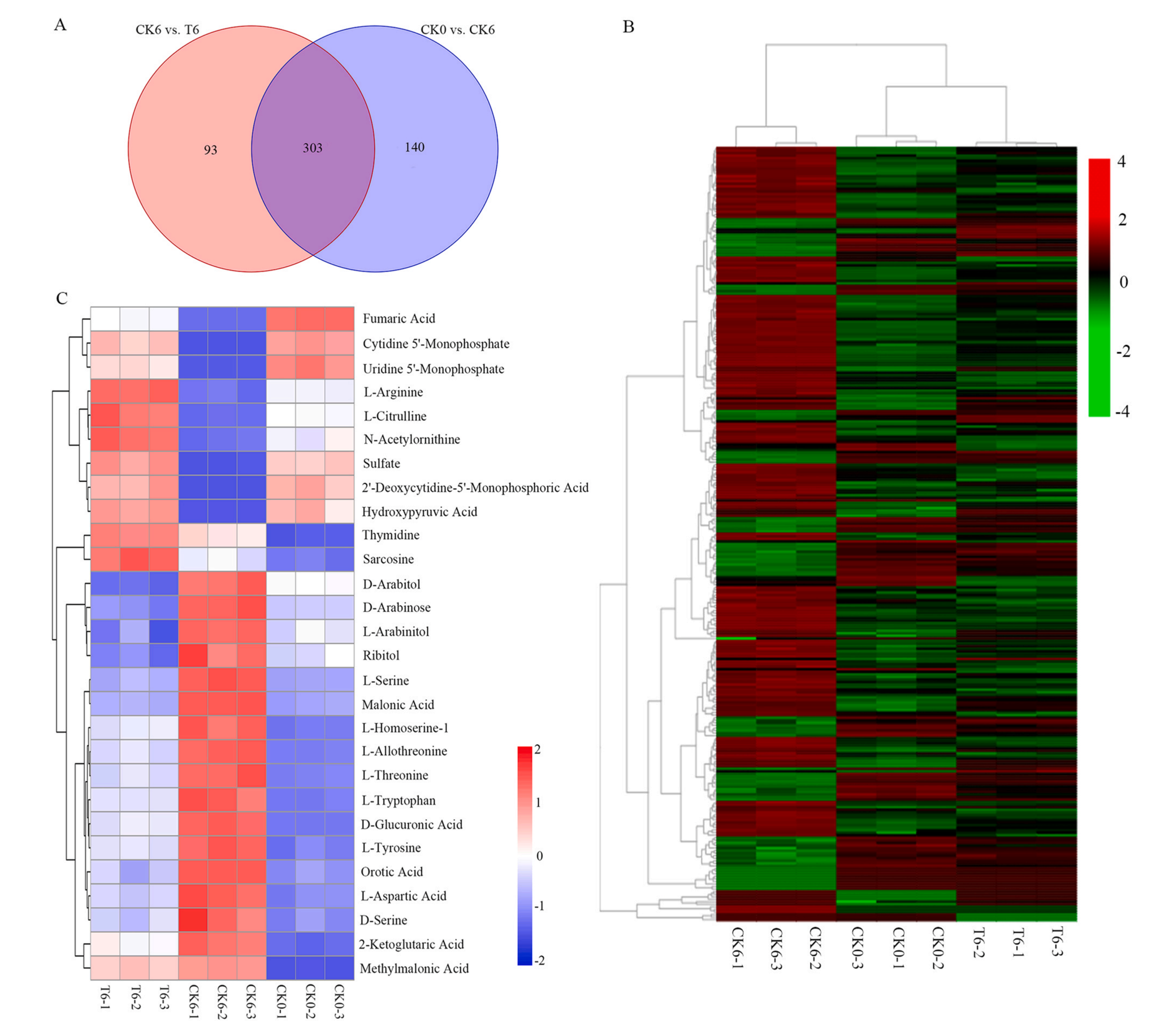 CK6和T6積累的差異代謝物表明H2S處理具有顯著影響。在396個顯著改變的DAMs中,152個上調,244個下調。氨基酸(66),有機酸(47),糖和醇(40),脂質(25),核苷酸(21)和維生素(4),萜類(51),生物堿(32),類黃酮(25),酮類,醛類,酸類(14),苯丙素(12),多酚(10),類固醇(9),香豆素(5),醌類(4),其他類(31)。這些DAMs主要與甘油磷脂代謝、嘧啶代謝、戊糖、甘氨酸、絲氨酸和蘇氨酸代謝有關。