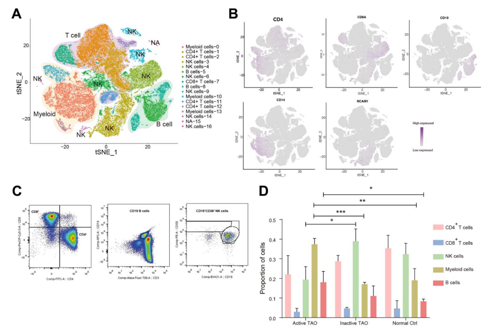 該研究使用10x Genomics Chromium平臺對總共9個樣本進(jìn)行了scRNA-seq。經(jīng)過初步質(zhì)量控制后,總共獲得了93,007個PBMC用于后續(xù)分析,其中包括來自活性TAO的23,051個細(xì)胞、來自非活性TAO的34797個細(xì)胞和來自正常對照 (NC) 的35,159個細(xì)胞?;趫D的聚類分析確定了17個不同的聚類。在手動確認(rèn)細(xì)胞類型注釋后,該研究成功將簇分為五種主要的PBMC細(xì)胞類型。其中包括各種CD4+ T細(xì)胞群 (CD4+)、NK (CD56+)、CD8+T細(xì)胞 (CD8A+)、B細(xì)胞 (CD19+) 和骨髓細(xì)胞 (CD11b+)(圖1A,1B)。通過流式細(xì)胞術(shù)分析驗(yàn)證了scRNA-seq鑒定的這五種細(xì)胞類型的存在(圖1C)。值得注意的是,17個細(xì)胞簇中的12個 (70.6%) 包含來自多個單獨(dú)樣本的至少100個細(xì)胞,每個簇內(nèi)平均有9個單獨(dú)樣本。