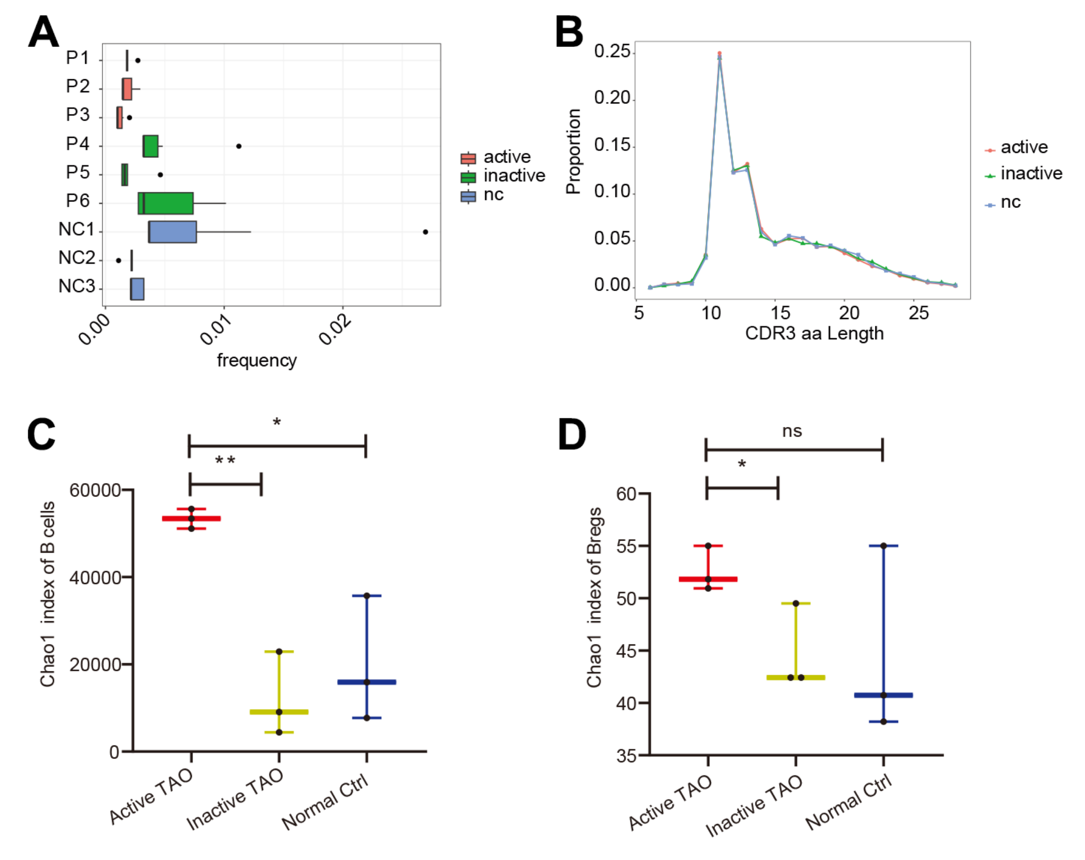 為了全面分析B細(xì)胞群中的基因表達(dá)和BCR多樣性,該研究對scRNA-seq分析中使用的PBMC樣本進(jìn)行了scBCR-seq。在活性TAO中,前10個克隆型的比例(0.17%)與非活性組(0.37%,p=0.010)和NC組(0.41%,p=9.31E-05)(圖3A)。然而,對互補(bǔ)決定區(qū)3 (CDR3) 長度的分析沒有顯示任何明顯的變化(圖3B)。當(dāng)檢查CDR3的多樣性時,通過Chao1指數(shù)量化,與NC組 (p=0.016) 和非活動TAO組 (p=0.002) (圖3C)。Breg細(xì)胞中也出現(xiàn)了類似的趨勢(圖 3D),與NC組相比顯著增加(p=0.011),但活性TAO之間沒有統(tǒng)計學(xué)顯著差異組和NC組 (p=0.213)。這些發(fā)現(xiàn)表明,雖然活性TAO中前10個克隆型的頻率降低,但在這種情況下CDR3序列的多樣性增加,這可能對免疫反應(yīng)的調(diào)節(jié)有影響,并有助于活性TAO的發(fā)病機(jī)制。