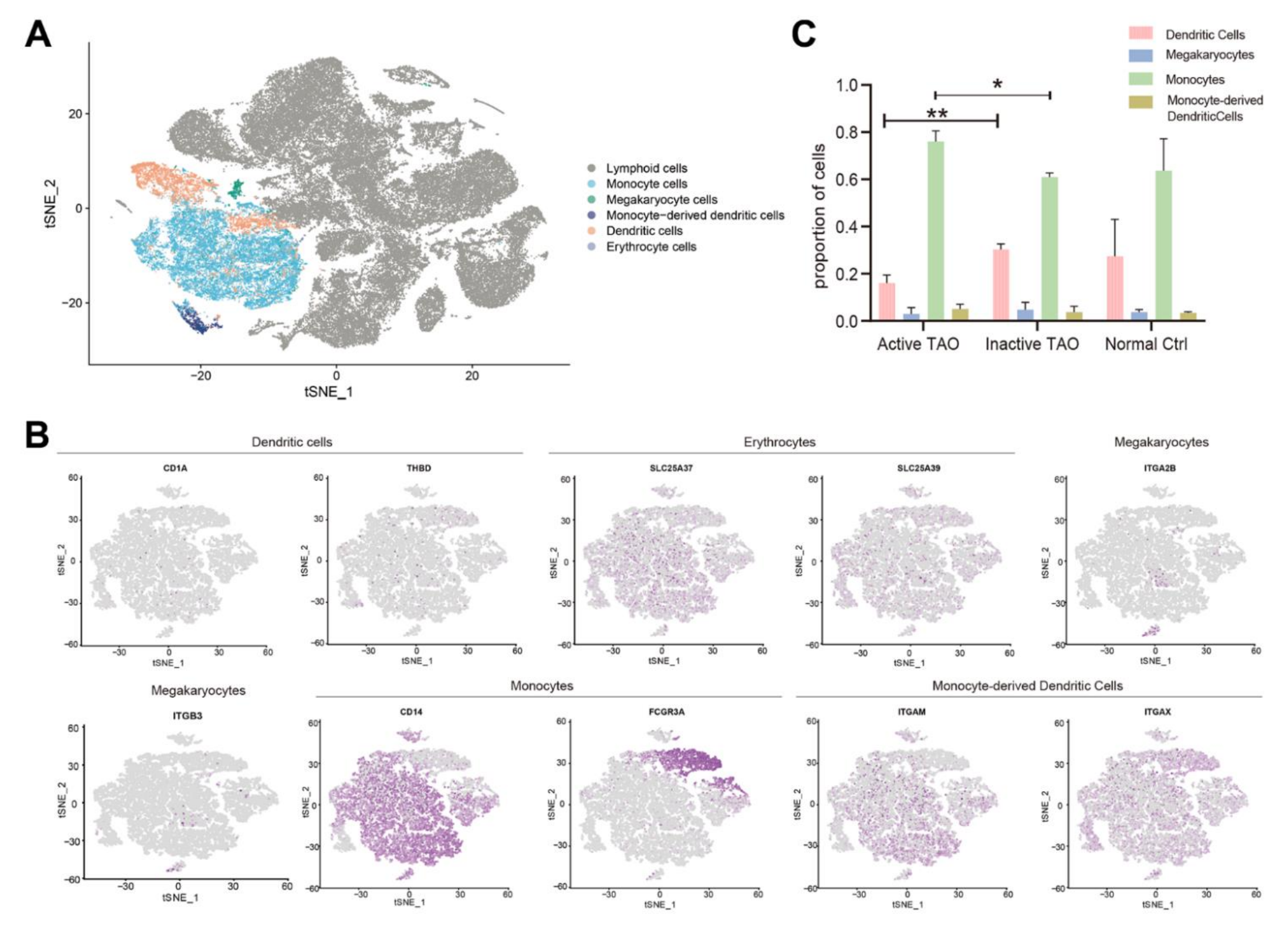 為了評估骨髓細(xì)胞在TAO中的參與情況,該研究鑒定了骨髓細(xì)胞的主要亞型,并檢查了它們在活性TAO中的配置。分析顯示了五種不同的骨髓細(xì)胞群,即單核細(xì)胞、巨核細(xì)胞、樹突狀細(xì)胞 (DC)、單核細(xì)胞衍生的DC和紅細(xì)胞(圖4A )。這些細(xì)胞類型的鑒定基于差異基因表達(dá)和對已建立的譜系標(biāo)記的檢查(圖4B)。活性TAO 和非活性TAO之間的比較揭示了單核細(xì)胞和DC比例的顯著差異。與非活動TAO組相比,活動TAO患者的單核細(xì)胞比例顯著較高 (p=0.006),而活動TAO中DC的比例顯著較低 (p= 0.003) (圖4C)。這些發(fā)現(xiàn)表明,單核細(xì)胞水平增加和DC數(shù)量減少可能是TAO患者活動性疾病狀態(tài)的特征。