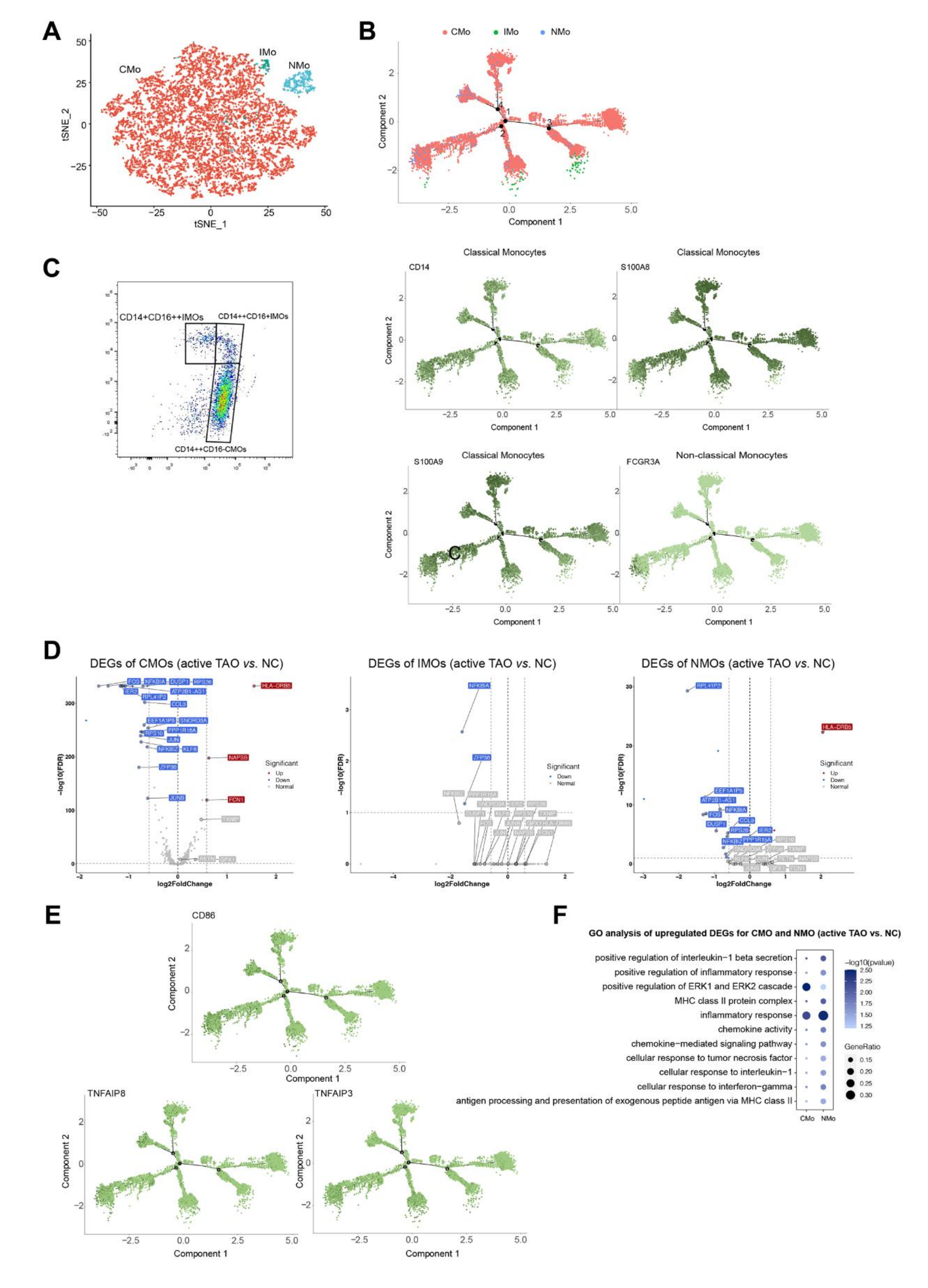 作者的聚類分析成功地從總共 12,959 個單核細(xì)胞中識別出三個不同的亞群。第一個簇的特征是經(jīng)典單核細(xì)胞 (CMO),其表現(xiàn)出高表達(dá)水平的CD14、S100A8 S100A9。第二個簇被鑒定為非經(jīng)典單核細(xì)胞 (NMO),其特征是高表達(dá)FCGR3A(也稱為 CD16)。第三簇被識別為中間單核細(xì)胞 (IMO),CD14FCGR3A均高表達(dá)(圖6A、6B)。為了驗(yàn)證這些單核細(xì)胞亞簇,進(jìn)行了流式細(xì)胞術(shù)分析,確認(rèn) CMO為CD14++CD16-,NMO為CD14+CD16++,IMO為CD14++CD16+(圖6C)。軌跡推斷分析表明,單核細(xì)胞遵循從CMO開始并向NMO和IMO狀態(tài)分支的發(fā)育軌跡(圖6B)。這些對TAO期間單核細(xì)胞發(fā)育狀態(tài)變化的觀察表明它們在該疾病中的潛在作用。