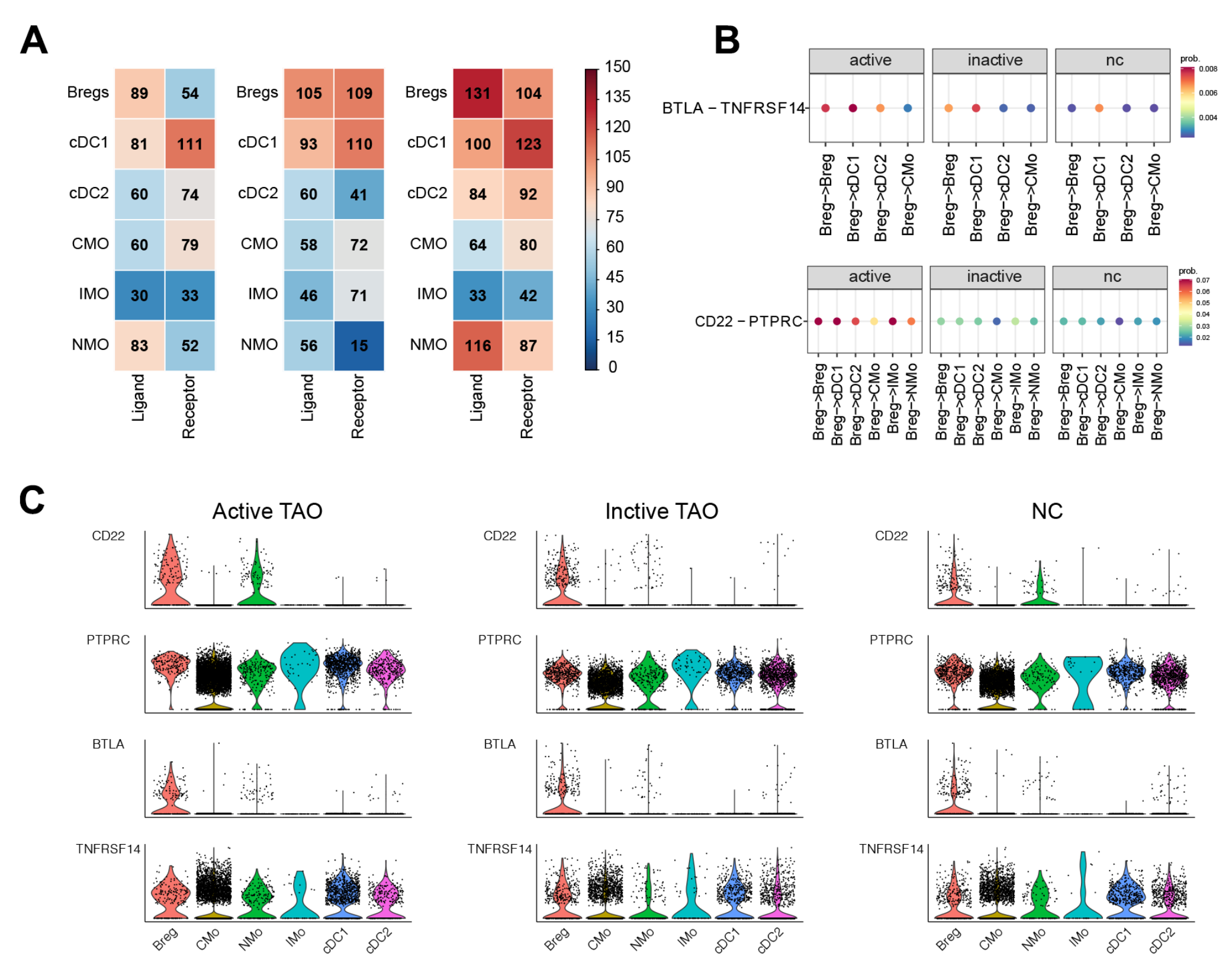 進(jìn)一步檢查了活躍TAO背景下Breg、DC和單核細(xì)胞之間的細(xì)胞相互作用。該分析總共確定了1,352對重要的相互作用。值得注意的是,Bregs被發(fā)現(xiàn)表現(xiàn)出最多數(shù)量的配體,而cDC1亞簇則表現(xiàn)出最多數(shù)量的受體。值得注意的是,與非活性TAO 和正常對照組(NC)相比,Bregs在活性TAO中顯示出配體數(shù)量增加(圖7A)。