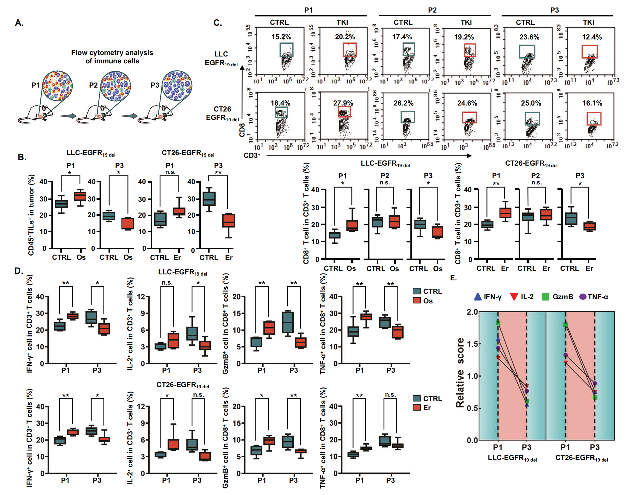 為了了解腫瘤免疫環(huán)境如何參與對(duì) EGFR-TKI 的耐藥性,作者分析了治療過程中不同階段的腫瘤免疫環(huán)境特征(圖 2A)。作者測定了初始 EGFR-TKIs 治療時(shí)和耐藥發(fā)展期間 (P1-P3) 腫瘤免疫環(huán)境中腫瘤浸潤白細(xì)胞 (TIL) 的密度,其中用鹽水處理的腫瘤細(xì)胞作為 CTRL 組,用厄洛替尼或奧希替尼治療的腫瘤細(xì)胞作為 TKI 組。流式細(xì)胞術(shù)分析的免疫分析顯示,在治療早期,攜帶 EGFR19del?的腫瘤的 EGFR-TKIs 治療誘導(dǎo)腫瘤浸潤白細(xì)胞比例增加(圖2B)。然而,當(dāng)荷瘤小鼠對(duì) EGFR-TKI 產(chǎn)生耐藥性時(shí),與 CTRL 組相比,腫瘤浸潤白細(xì)胞的比例顯著降低(圖2B)。這表明荷瘤小鼠對(duì) EGFR-TKIs 的反應(yīng)性改變伴隨著腫瘤免疫環(huán)境的動(dòng)態(tài)變化。