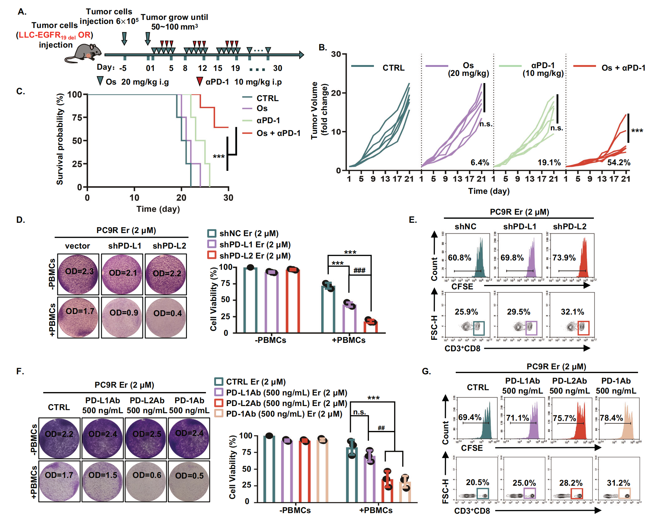 接下來,作者想進(jìn)一步探討阻斷 EGFR-TKI 耐藥細(xì)胞中的 PD-L2/PD-1 是否可以通過增強(qiáng)免疫反應(yīng)來增強(qiáng)腫瘤細(xì)胞對(duì) EGFR-TKIs 的敏感性。作者建立了攜帶對(duì)奧希替尼耐藥的 LLC-EGFR19del?衍生腫瘤的同基因小鼠模型。小鼠接受生理鹽水 (CTRL)、奧希替尼 (Os)、抗 PD-1 (αPD-1) 和奧希替尼 + 抗 PD-1 (Combi) 治療(圖5A)。作者的結(jié)果表明,與 CTRL 組相比,單獨(dú)使用奧希替尼組小鼠的腫瘤體積和生存時(shí)間沒有顯著差異。PD-1 抑制劑對(duì) EGFR-TKI 耐藥腫瘤表現(xiàn)出部分抑制,并導(dǎo)致小鼠存活時(shí)間適度延長,盡管沒有統(tǒng)計(jì)學(xué)意義。然而,奧希替尼和抗 PD-1 的組合顯著抑制了腫瘤生長并延長了攜帶耐藥腫瘤的小鼠的生存期(圖5B,C)。以上結(jié)果表明,抑制 PD-1 與 EGFR-TKI 聯(lián)合有效抑制了 EGFR-TKI 耐藥腫瘤的生長。