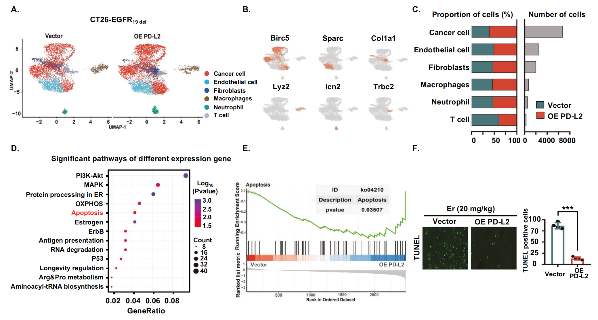 接下來,作者進(jìn)一步探討了 PD-L2 表達(dá)升高影響免疫反應(yīng)以降低腫瘤對(duì) EGFR-TKIs 敏感性的機(jī)制。作者獲得了來自空載體或 PD-L2 過表達(dá)的同基因小鼠中 CT26-EGFR19del?細(xì)胞的腫瘤組織的單細(xì)胞轉(zhuǎn)錄組譜。作者對(duì)來自空載體樣本和 PD-L2 過表達(dá)樣本的整合單細(xì)胞數(shù)據(jù)集進(jìn)行了聚類分析,并確定了六個(gè)主要的不同細(xì)胞群(圖6A、B)。作者發(fā)現(xiàn) PD-L2 過表達(dá)組中癌細(xì)胞的數(shù)量顯著增加,T 細(xì)胞的比例顯著降低(圖6C)。為了探索 EGFR-TKIs 耐藥的機(jī)制,作者分析了癌細(xì)胞的轉(zhuǎn)錄組特征。與空載體組相比,對(duì) PD-L2 過表達(dá)組的差異表達(dá)基因進(jìn)行 KEGG 富集分析。作者觀察到細(xì)胞凋亡通路顯著富集(圖 6D)。GSEA 分析顯示,PD-L2 過表達(dá)組癌細(xì)胞中與細(xì)胞凋亡途徑相關(guān)的基因顯著下調(diào)(圖6E)。這些結(jié)果表明,EGFR 突變腫瘤細(xì)胞中 PD-L2 表達(dá)的增加可導(dǎo)致細(xì)胞凋亡減少。作者的體內(nèi)實(shí)驗(yàn)數(shù)據(jù)進(jìn)一步驗(yàn)證了這些結(jié)論。TUNEL 染色顯示,與對(duì)照組相比,TKI 處理后 CT26-EGFR19del?PD-L2 過表達(dá)組腫瘤細(xì)胞凋亡受到顯著抑制(圖6F)?;谶@些結(jié)果,作者假設(shè) EGFR 突變的腫瘤細(xì)胞中 PD-L2 表達(dá)增加會(huì)抑制癌細(xì)胞的凋亡,從而導(dǎo)致癌細(xì)胞的持續(xù)生長,耐藥性增加。