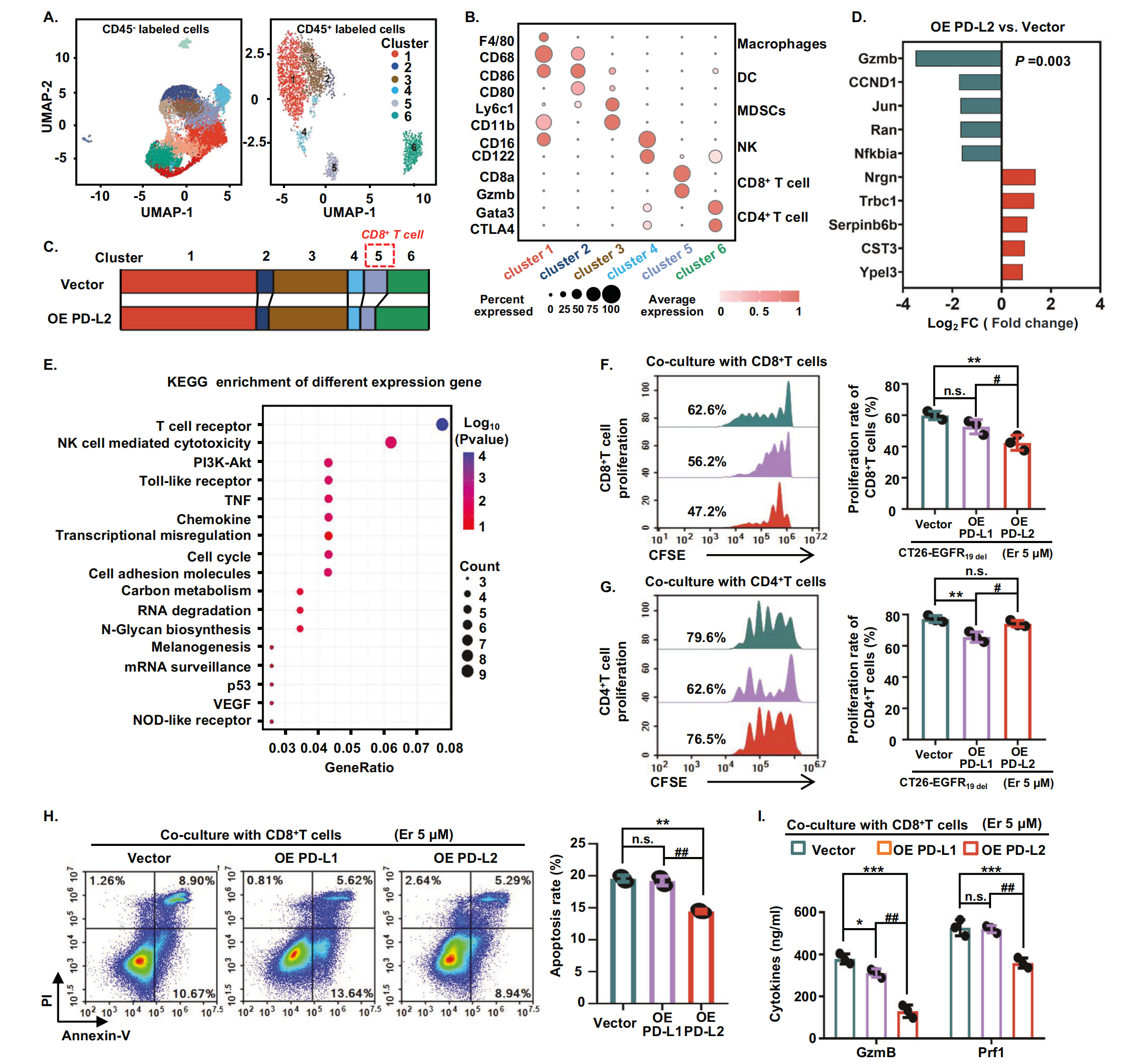 為了進(jìn)一步了解 PD-L2 對(duì)腫瘤免疫環(huán)境的抑制作用,作者回到了作者的單細(xì)胞測序數(shù)據(jù)。根據(jù) CD45 的表達(dá),將空載體和 PD-L2 過表達(dá)組的腫瘤環(huán)境中細(xì)胞分為 CD45-?腫瘤細(xì)胞和 CD45+?免疫細(xì)胞(圖7A)。然后根據(jù)已知遺傳標(biāo)記的表達(dá)和細(xì)胞亞群的特異性注釋對(duì) CD45+?免疫細(xì)胞進(jìn)行分組(圖 7B)。在 PD-L2 過表達(dá)組中,作者觀察到 CD8+?T 細(xì)胞群的大小顯著減小(圖7B,C)。因此,作者通過 KEGG 富集分析了空載體組和 PD-L2 過表達(dá)組 CD8+?T 細(xì)胞中的差異表達(dá)基因(圖 7D)。作者發(fā)現(xiàn)與增殖和細(xì)胞毒功能相關(guān)的通路顯著富集(圖7E)。為了進(jìn)一步證實(shí) PD-L2 過表達(dá)顯著影響 CD8+?T 細(xì)胞活性,作者從總 T 細(xì)胞中分離 CD8+?T 細(xì)胞,并將它們與 PD-L1 或 PD-L2 基因操縱的小鼠腫瘤細(xì)胞共培養(yǎng)。結(jié)果顯示,CD8+?T 細(xì)胞的增殖在 PD-L2 過表達(dá)細(xì)胞中受到顯著抑制,而在 PD-L1 過表達(dá)細(xì)胞中則不受抑制(圖7F)。然后,作者從總 T 細(xì)胞中分離 CD4+?T 細(xì)胞,并將它們與 PD-L1 或 PD-L2 基因操縱的小鼠腫瘤細(xì)胞共培養(yǎng)。值得注意的是,PD-L2 過表達(dá)對(duì) CD4+?T 細(xì)胞的增殖沒有影響,而 PD-L1 過表達(dá)顯著抑制了 CD4+?T 細(xì)胞的增殖(圖7G)。這表明 PD-L2 和 PD-L1 介導(dǎo) T 細(xì)胞抑制的分子機(jī)制存在差異。