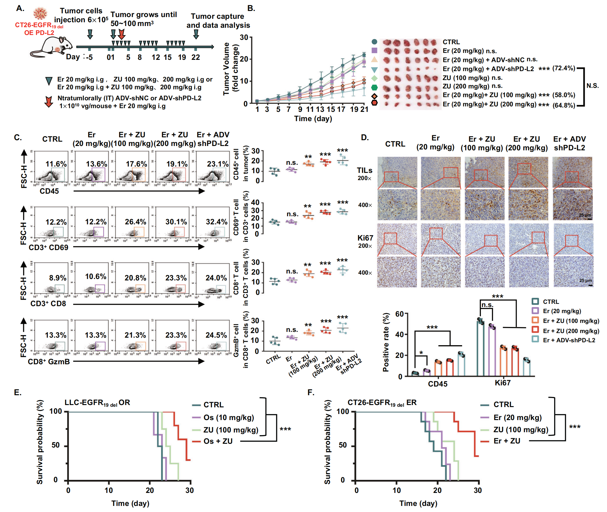 為了進(jìn)一步證實(shí) ZU 和 EGFR-TKIs 的組合協(xié)同改善腫瘤免疫環(huán)境并逆轉(zhuǎn)腫瘤耐藥性,作者評(píng)估了 ZU + 厄洛替尼在攜帶 PD-L2 過表達(dá)的 CT26-EGFR19del?來源的腫瘤的 BALB/c 同基因小鼠中的療效(圖9A)。腫瘤體積曲線顯示,與鹽水處理組相比,單獨(dú)使用厄洛替尼在治療 15 天后表現(xiàn)出邊緣性腫瘤生長抑制(圖9B),這表明 PD-L2 的過表達(dá)增加了腫瘤細(xì)胞對(duì) TKI 的耐藥性。ZU 單次治療并未阻斷腫瘤生長(圖9B),這表明單獨(dú)靶向 PD-L2 不能逆轉(zhuǎn)厄洛替尼耐藥性。正如預(yù)期的那樣,陽性對(duì)照組 (Er + ADVshPD-L2) 在所有測試的模型中反應(yīng)最好(圖9B)。此外,ZU + 厄洛替尼組與陽性對(duì)照組相比沒有顯著差異,這表明 ZU 可以有效抑制 PD-L2,并且當(dāng)與厄洛替尼聯(lián)合使用時(shí),可以顯著逆轉(zhuǎn)厄洛替尼耐藥性(圖9B)。此外,流式細(xì)胞術(shù)和免疫組化結(jié)果顯示,聯(lián)合治療增加了腫瘤組織中浸潤白細(xì)胞(CD45+)的比例、T 細(xì)胞的活化 (CD3+CD69+)以及CD8+?T 細(xì)胞(CD8+GzmB+)的比例和功能(圖9C)。免疫組化顯示,聯(lián)合治療顯著抑制了增殖(圖9D)。為了全面評(píng)價(jià) EGFR-TKIs 聯(lián)合 ZU 的療效,作者建立了攜帶對(duì)奧希替尼耐藥的 LLC-EGFR19del?衍生腫瘤和對(duì)厄洛替尼耐藥的 CT26 EGFR19del?衍生腫瘤的同基因小鼠模型。小鼠接受生理鹽水(CTRL)、單獨(dú) EGFR-TKIs、 單獨(dú) ZU和EGFR-TKIs + ZU處理。作者的結(jié)果表明,與生理鹽水組相比,單獨(dú)使用 EGFR-TKIs 組或單獨(dú)使用 ZU 組小鼠的生存時(shí)間沒有顯著差異(圖9E, F)。然而,ZU 和 EGFR-TKIs(奧希替尼或厄洛替尼)的組合顯著延長了攜帶耐藥腫瘤的小鼠的生存期(圖9E,F(xiàn))。這些結(jié)果表明,ZU 聯(lián)合 EGFR-TKIs 可以通過改善同基因小鼠模型中的腫瘤免疫環(huán)境來有效逆轉(zhuǎn)對(duì) EGFR-TKIs 的耐藥性。綜上所述,ZU 通過抑制 PD-L2 增強(qiáng) CD8+?T 細(xì)胞的功能,其與 EGFR-TKIs 的聯(lián)合作用可有效抑制耐藥腫瘤的增殖。