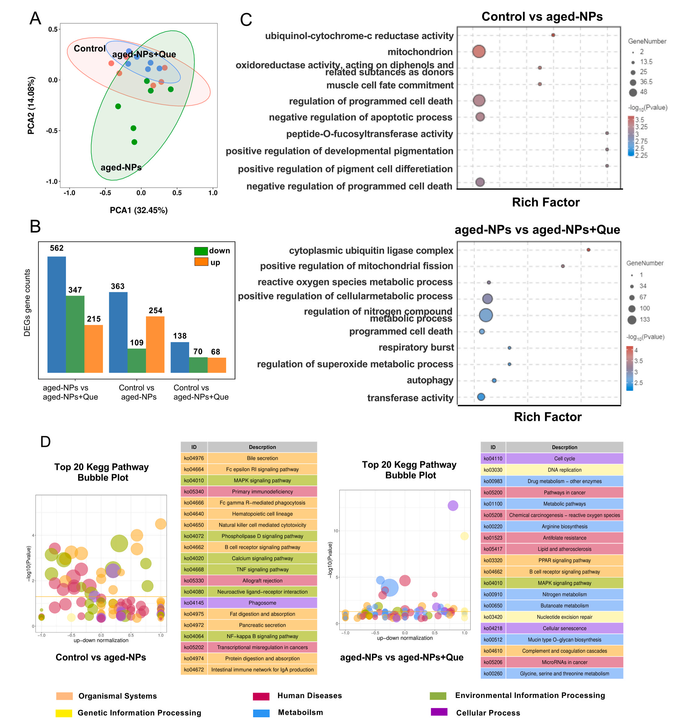 采用RNA測序(RNA-seq)檢測老化NPs和Que對腸道的影響,與對照組相比,老化NPs共鑒定出363個差異表達基因(DEGs),包括254/ 109個上調/下調基因,與老化NPs相比,老化NPs+Que組中的DEGs為562個,包括347/215個上調/下調基因,GO富集結果顯示老化NPs暴露后,顯著富集集中在生物過程中,如肌肉細胞命運決定、程序性細胞死亡的調節(jié)和凋亡過程的負調控。