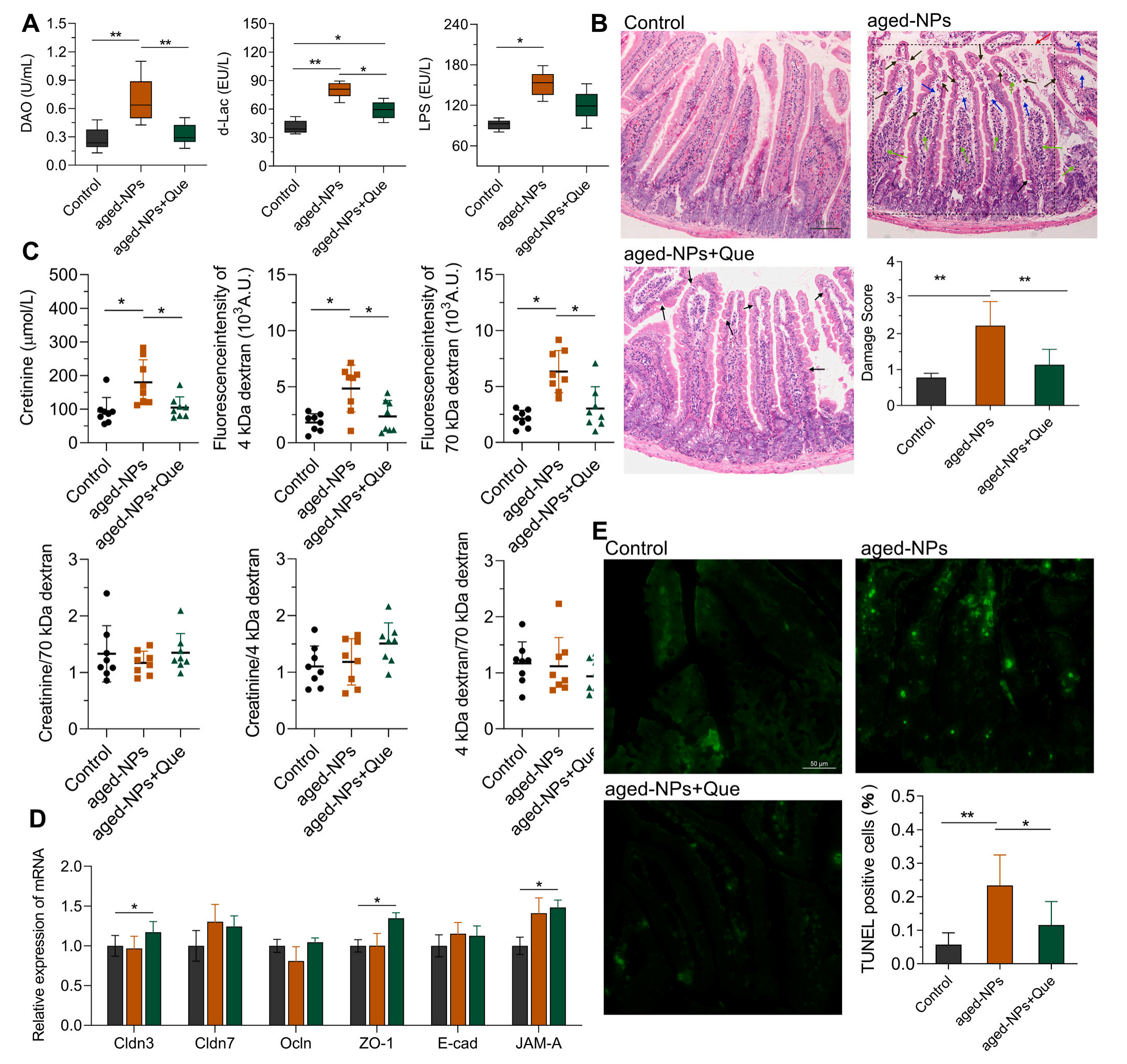 槲皮素 (Que) 占膳食總黃酮類化合物的 60-75%,是一種天然化合物,存在于人類飲食中的各種食物中,包括蔬菜、水果和茶,Que 及其衍生物可以調節(jié)多個細胞內靶標和細胞信號傳導過程的能力,具有抗氧化和抗炎分子的作用,探索膳食補充劑 Que 是否可以改善 NPs 誘導的腸道屏障功能障礙具有重要意義。本研究通過轉錄組學、組織病理學和免疫學分析探討老化 NPs 暴露下腸道屏障損傷的機制,此外,還評估了 Que 在老化 NPs 暴露下對腸道屏障的積極影響。