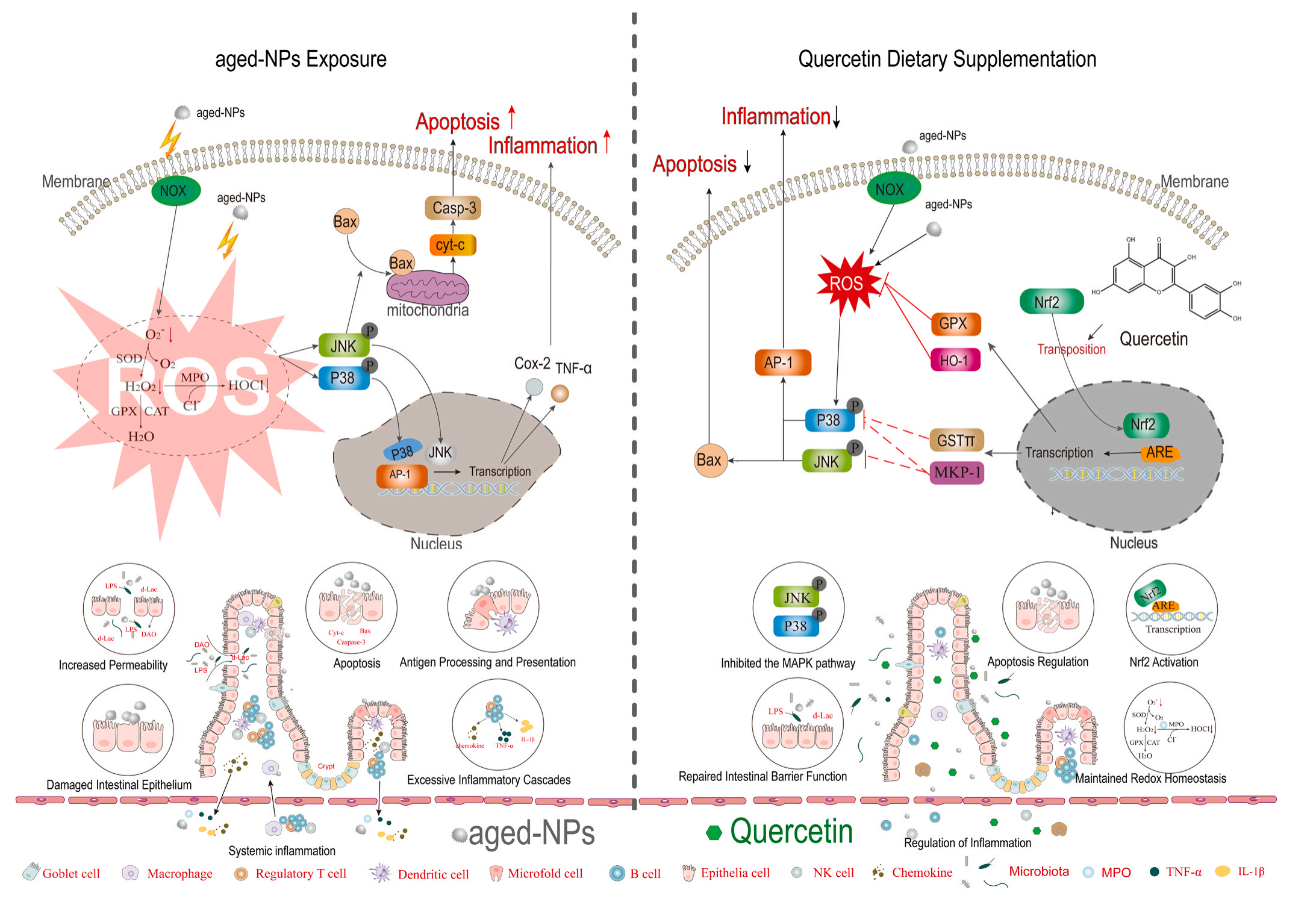 微塑料/納米塑料(MPs/NPs)是由較大的塑料碎片的老化過程形成的,會造成對免疫穩(wěn)態(tài)的破壞和腸道功能障礙,人類攝取MPs/NPs的方式主要是通過攝入食物和飲料,MPs/NPs被魚類或海洋生物攝入后通過食物鏈積累并以食物方式進入人體,老化的納米塑料(NPs)具有獨特的環(huán)境作用特性,如表面粗糙、高氧含量等,有研究強調了老化NPs的潛在危害,但目前的研究為老化NPs污染修復提供了策略,槲皮素的飲食干預是解決老化NPs健康風險的一個新見解。