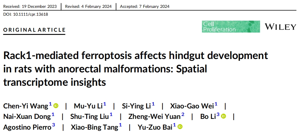 2024年7月,中國(guó)醫(yī)科大學(xué)盛京醫(yī)院在國(guó)際學(xué)術(shù)期刊cell proliferation發(fā)表一項(xiàng)重要研究成果,題為:Rack1‐mediated ferroptosis affects hindgut development in rats with anorectal malformations: Spatial transcriptome insights。使用空間轉(zhuǎn)錄組測(cè)序、免疫熒光、CCK-8、WB、ROS檢測(cè)等來(lái)剖析直腸肛門(mén)畸形的發(fā)育機(jī)制。
