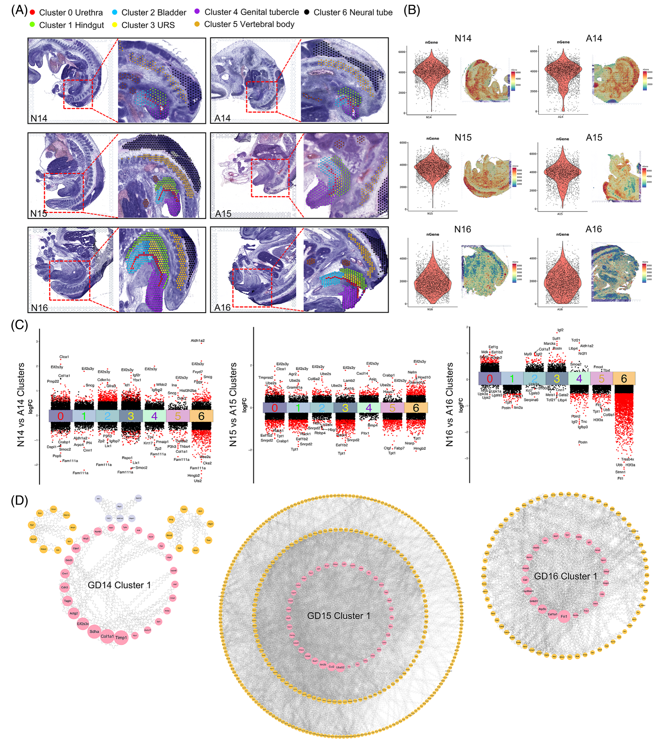 在這項(xiàng)研究中,作者在 GDs 14-16 (稱(chēng)為 N14-16) 上使用正常的 Wistar 大鼠胚胎,在 GDs 14-16 (稱(chēng)為 A14-16) 上使用 ETU 誘導(dǎo)的 ARM 胚胎進(jìn)行空間轉(zhuǎn)錄組測(cè)序。制備大鼠胚胎的 6 個(gè)冷凍中矢狀切片,每個(gè) 10 μm 厚。這些切片包括尿道和后腸層,提供了特定時(shí)間點(diǎn)泄殖腔發(fā)育的全面視圖(圖 1A)。使用 10× Genomics Visium 空間轉(zhuǎn)錄組技術(shù),然后進(jìn)行組織透化、cDNA 合成和文庫(kù)構(gòu)建,作者成功地捕獲了正常和 ARM 胚胎中的視覺(jué)基因轉(zhuǎn)錄數(shù)據(jù),主要來(lái)自泄殖腔區(qū)域。為了確保來(lái)自同一區(qū)域的各種切片樣本之間的可比性和一致性,作者進(jìn)行了聚類(lèi)注釋?zhuān)a(chǎn)生了七個(gè)不同的聚類(lèi)。這些集群包括泄殖腔區(qū)域內(nèi)的五個(gè)特定區(qū)域(集群 0-4),即尿道、后腸、膀胱、URS 和生殖器結(jié)節(jié)。此外,兩個(gè)簇 (簇 5 和 6) 對(duì)應(yīng)于椎體和神經(jīng)管區(qū)域 (圖 1A)。平均而言,每個(gè)解剖區(qū)域覆蓋 3005 個(gè)點(diǎn),每個(gè)點(diǎn)捕獲 16,905 個(gè)基因(圖 1B)。
