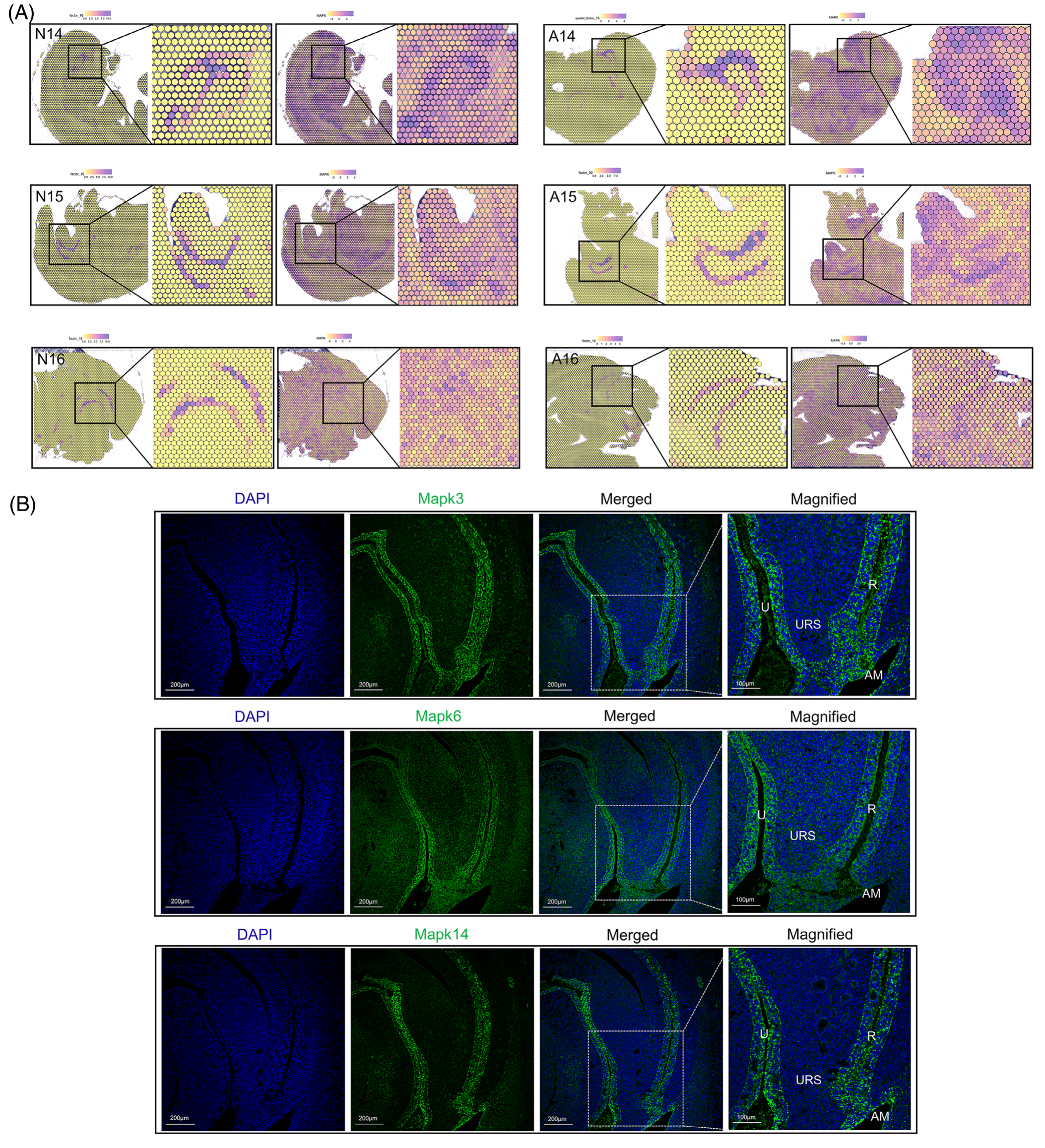 PROGENy 算法用于通過(guò)下游基因表達(dá)的變化評(píng)估信號(hào)通路的活性。作者獲得了正常組和 ARM 組 GDs 14-16 樣本中不同通路的活性水平評(píng)分。在使用 NNMF 對(duì)后腸區(qū)域(N14 因子 16、A14 因子 15、N15 因子 15、A15 因子 20、N16 因子 18 和 A16 因子 10)進(jìn)行聚類(lèi)分析中,PROGENy 算法顯示與 MAPK 信號(hào)通路呈強(qiáng)正相關(guān),表明 MAPK 信號(hào)在后腸中顯著富集(圖 3A)。從這些區(qū)域提取來(lái)自 Erk、P38、JNK 和 Erk5 家族的 12 個(gè)成員分子的定位表達(dá)模式。具體來(lái)說(shuō),Mapk3 、 Mapk6 和 Mapk14 主要富集在泄殖腔區(qū)域。這些蛋白質(zhì)的免疫熒光驗(yàn)證證實(shí)了它們?cè)谀虻篮秃竽c區(qū)域的特異性表達(dá),在 URS 和間質(zhì)區(qū)域的表達(dá)相對(duì)較弱,這與 PROGENy 預(yù)測(cè)一致(圖 3B)。