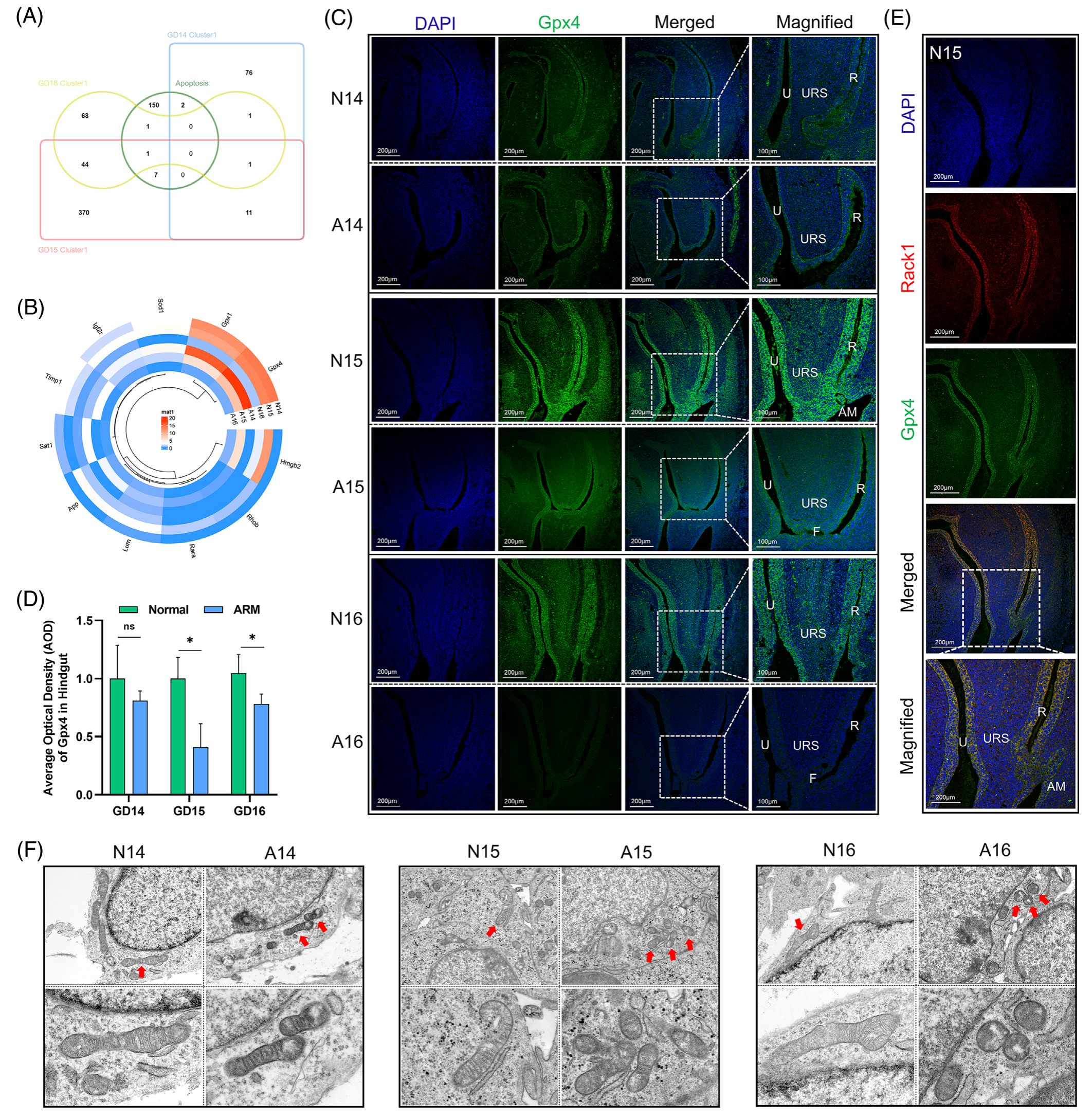 在基因集富集分析(GSEA)數(shù)據(jù)庫(kù)中,細(xì)胞死亡基因集包含161個(gè)基因,其中 7 個(gè)細(xì)胞死亡相關(guān)基因是從基因集與GD 15上簇1中的 DEGs 交集中獲得的(圖 4A)。圓形熱圖顯示了與聚類(lèi)1的6個(gè)樣本相同區(qū)域內(nèi)的細(xì)胞死亡基因的表達(dá)譜。值得注意的是,發(fā)現(xiàn)谷胱甘肽過(guò)氧化物酶家族的關(guān)鍵成員?Gpx4?在 GD 15 的簇 1 中下調(diào)(p < 0.05;圖 4B)。免疫熒光染色顯示 Gpx4 蛋白在尿道和后腸上皮以及 AM 區(qū)域的顯著定位,在 URS 中觀察到的分布相對(duì)較淺。在 ARM 組的泄殖腔中觀察到 Gpx4 陽(yáng)性信號(hào)的減少(圖 4C)。AOD 分析表明,在 GDs 15 和 16 上,后腸中 Gpx4 表達(dá)在統(tǒng)計(jì)學(xué)上顯著降低(p < 0.05;圖 4D)。