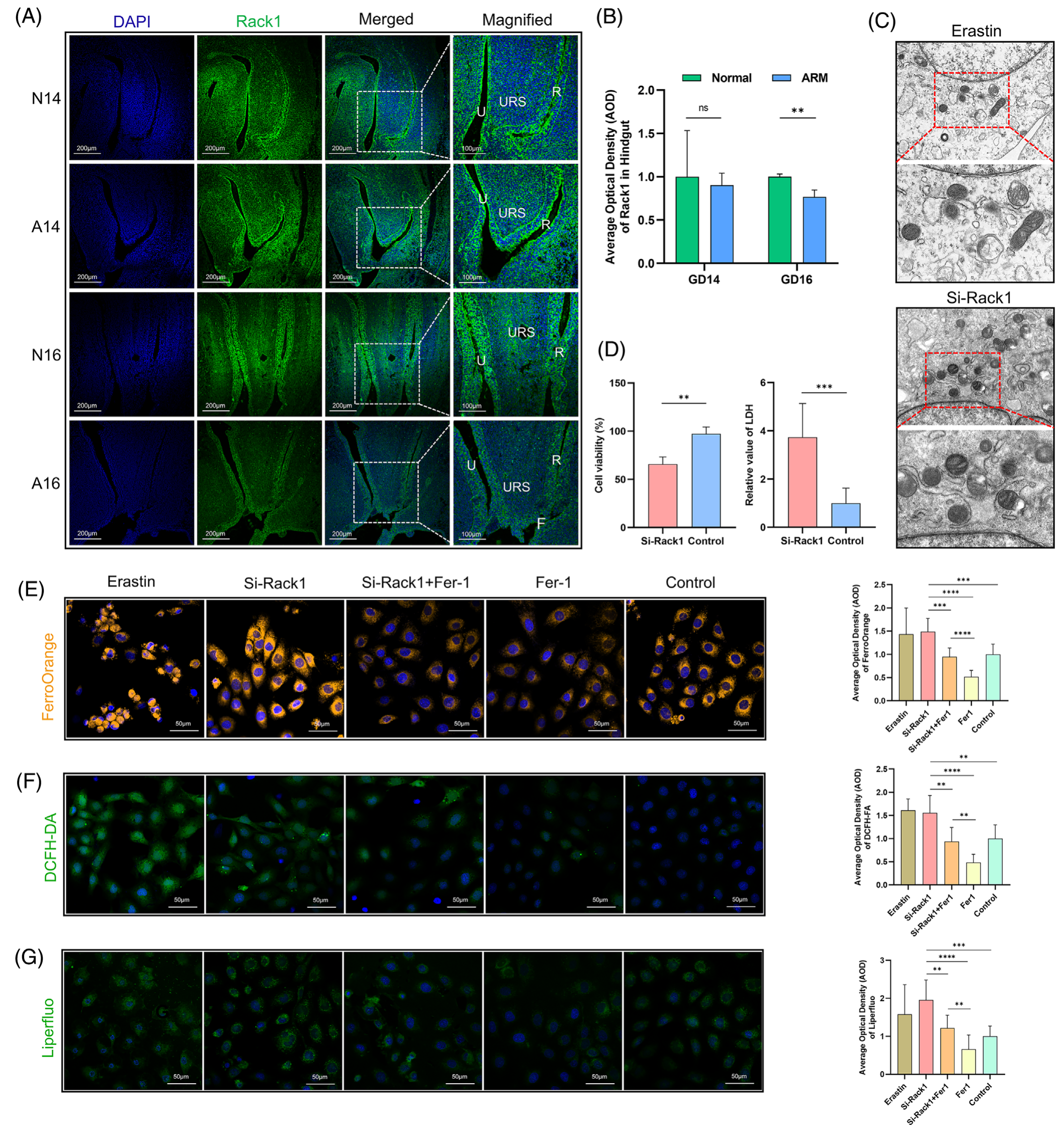 N15 胚胎石蠟切片的雙免疫熒光染色顯示 Rack1 和 Gpx4 蛋白在尿道和后腸上皮內(nèi)共定位。該結(jié)果表明 Rack1 在調(diào)節(jié)這些組織中的鐵死亡中的潛在作用 (圖 4E)。隨后,進(jìn)行顯微解剖以獲得正常和 ARM 胚胎的后腸組織。透射電子顯微鏡 (TEM) 顯示 ARM 組細(xì)胞線粒體體積減小,線粒體密度增加,線粒體嵴減少。這些觀察結(jié)果與與鐵死亡發(fā)生相關(guān)的線粒體形態(tài)變化一致(圖 4F)。