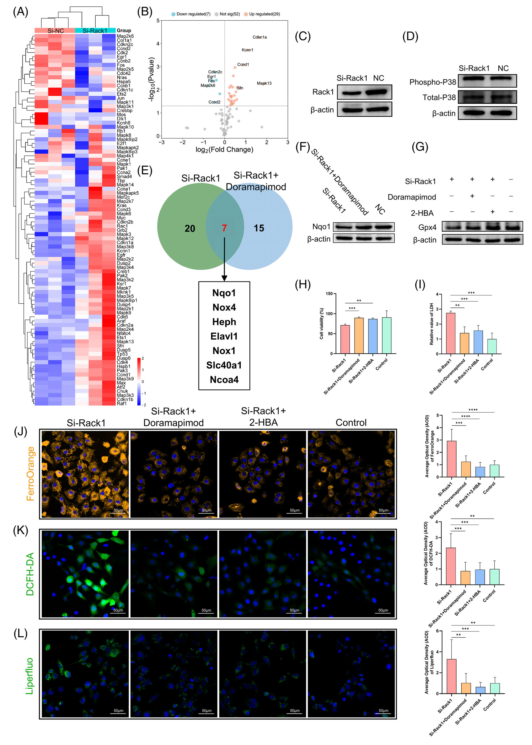 圖6-Rack1 敲低可增強(qiáng) P38 磷酸化并調(diào)節(jié)下游 Nqo1/Gpx4 表達(dá)