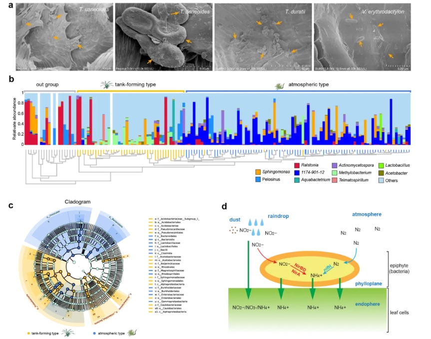 在解決了水分吸收問題后,另一個(gè)對(duì)空氣植物生存至關(guān)重要的問題是養(yǎng)分問題。研究人員通過16S rRNA測序和宏基因組分析,發(fā)現(xiàn)空氣鳳梨葉表附生了大量固氮細(xì)菌(圖7a),且這些細(xì)菌具有特異性,特別是1174-901-12屬細(xì)菌,專一性地附生在空氣鳳梨的葉表,并且在細(xì)菌類群中占據(jù)主要地位,可能與空氣鳳梨共進(jìn)化(圖7b-c)。此外,固氮酶nifA和nifH的發(fā)現(xiàn)進(jìn)一步證實(shí)了這些細(xì)菌的固氮能力(圖7d)。這些固氮細(xì)菌可能成為空氣植物的主要氮源,尤其在營養(yǎng)匱乏的空中環(huán)境中尤為重要。