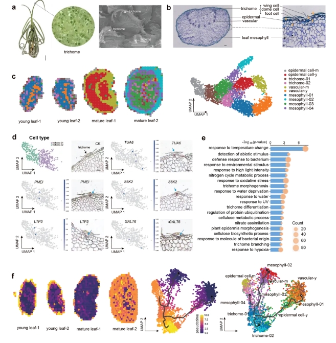 隨著根部失去吸收水分和養(yǎng)分的能力,附生鳳梨科植物的葉片表皮中特化的表皮毛進(jìn)化出了吸收功能,代替根系,實(shí)現(xiàn)了“器官功能互補(bǔ)”。這些多細(xì)胞表皮毛由基部活細(xì)胞和死盾形部分組成,表面覆蓋薄層角質(zhì)層,能夠阻止毛細(xì)管流動(dòng),這對(duì)其吸收功能至關(guān)重要。研究人員通過大規(guī)模比較基因組分析鑒定出與角質(zhì)合成相關(guān)的三個(gè)關(guān)鍵串聯(lián)重復(fù)基因——CYP96A15(圖5a)。這三個(gè)基因在所有附生鳳梨植物中經(jīng)歷序列變異后被選擇并固定(圖5b)。在原位雜交實(shí)驗(yàn)中,發(fā)現(xiàn)這些CYP96A15重復(fù)基因在表皮毛的頂端和基部細(xì)胞中特異性表達(dá)(圖5c),進(jìn)一步表明它們可能在空氣鳳梨表皮毛吸收功能的獲得中發(fā)揮了關(guān)鍵作用。此外,研究人員還通過空間轉(zhuǎn)錄組技術(shù),鑒定出多個(gè)在表皮毛細(xì)胞中特異性表達(dá)的基因,為后續(xù)空氣鳳梨表皮毛的研究提供了新的突破口(圖6)。