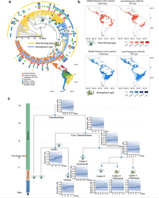 為了追溯空氣鳳梨的起源,研究人員廣泛收集了覆蓋空氣鳳梨亞科(Tillandsioideae)78%屬的植物,利用轉(zhuǎn)錄組測序獲得低拷貝基因的91個(gè)核基因,構(gòu)建了空氣鳳梨亞科植物系統(tǒng)發(fā)育樹(圖1)。然后通過祖先重建和分子鐘計(jì)算,發(fā)現(xiàn)核心空氣鳳梨亞科植物起源于11.3百萬年前的安第斯山脈,祖先類型為積水型鳳梨(圖2a)。大約在6百萬年前,安第斯山脈快速隆起,推動(dòng)了物種的分化,完全大氣生的空氣鳳梨出現(xiàn),這些植物通常被稱為“air plants”。地球氣候世代的轉(zhuǎn)變也加速了物種的分化(圖2b-c)。