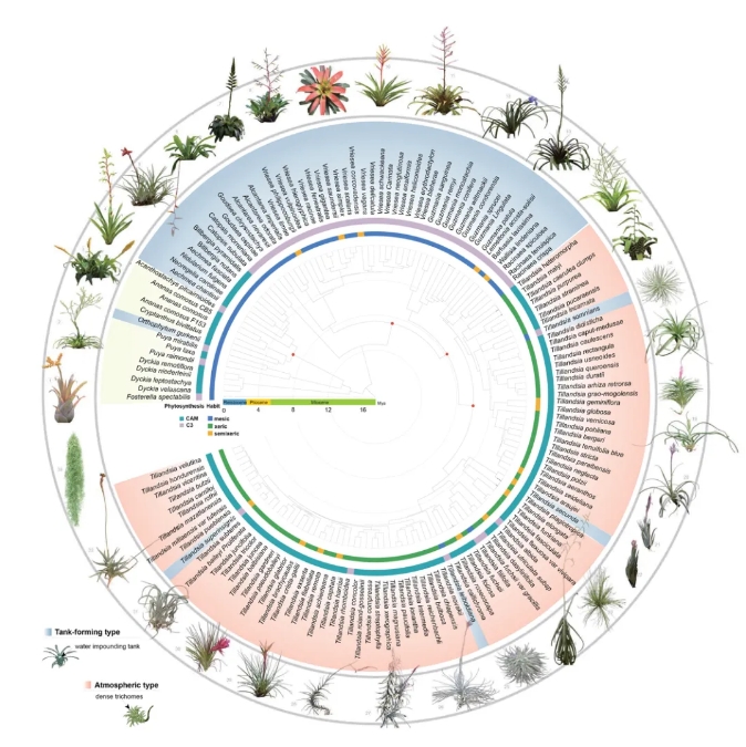 近日,浙江大學(xué)農(nóng)學(xué)院張明方/喻景權(quán)團(tuán)隊(duì)聯(lián)合上海辰山植物園等單位,在Nature Communications期刊上發(fā)表了題為Tracing the evolutionary and genetic footprints of atmospheric tillandsioids transition from land to air的研究成果。該研究采用多組學(xué)方法,解析了空氣鳳梨的起源與進(jìn)化時(shí)間、地點(diǎn),探討了推動(dòng)其進(jìn)化的動(dòng)力學(xué)因素,并揭示了其獨(dú)特適應(yīng)性器官特征的遺傳基礎(chǔ),以及在空中環(huán)境中獲取營養(yǎng)的生存策略。