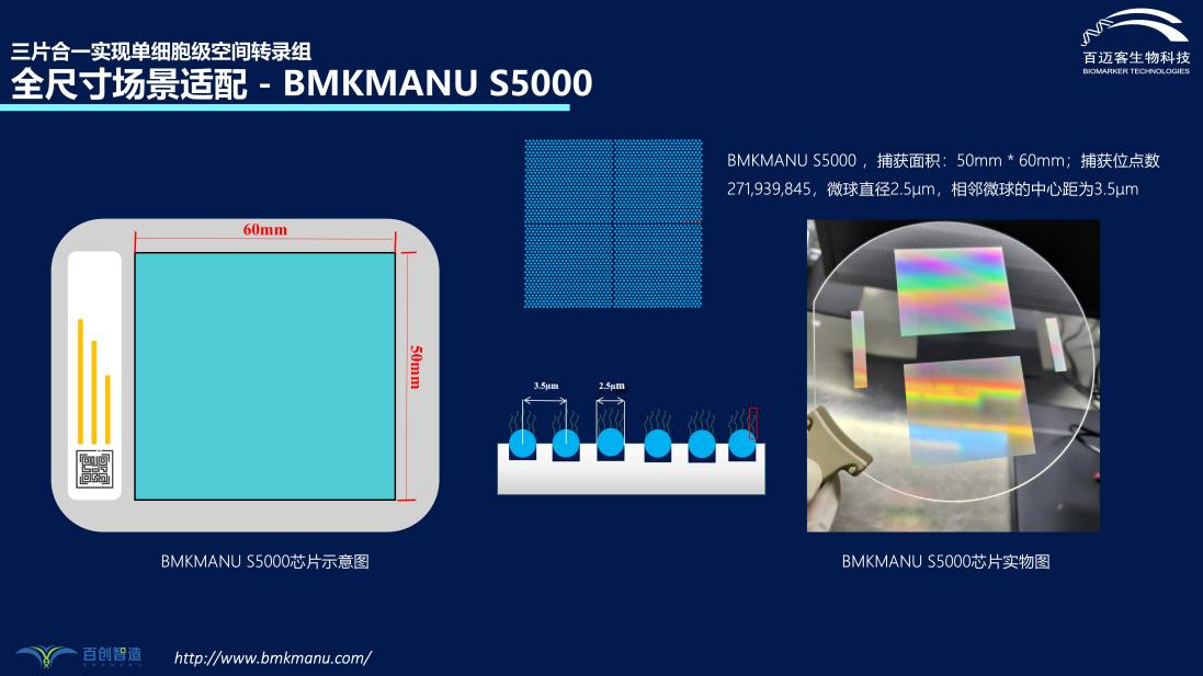 隨著百邁客生物在時(shí)空組學(xué)領(lǐng)域的不斷探索,在保證具備亞細(xì)胞分辨率的條件下,研究團(tuán)隊(duì)已成功完成了全尺寸場景適配捕獲芯片BMKMANU S5000的研發(fā)與測試。捕獲面積:50mm*60mm;捕獲位點(diǎn)數(shù):271,939,845;微球直徑:2.5μm;相鄰微球的中心距為3.5μm。該產(chǎn)品的推出大大降低了空間轉(zhuǎn)錄組實(shí)驗(yàn)對(duì)樣本尺寸的限制,將更大程度地滿足當(dāng)前科研需求。