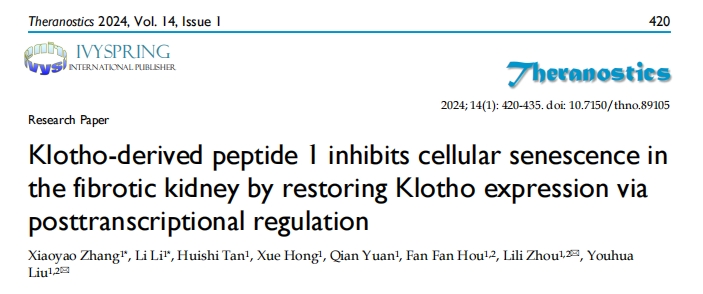 [2] Zhang X, Li L, Tan H, Hong X, Yuan Q, Hou FF, Zhou L, Liu Y. Klotho-derived peptide 1 inhibits cellular senescence in the fibrotic kidney by restoring Klotho expression via posttranscriptional regulation. Theranostics. 2024 Jan 1;14(1):420-435. doi: 10.7150/thno.89105. PMID: 38164143; PMCID: PMC10750200.