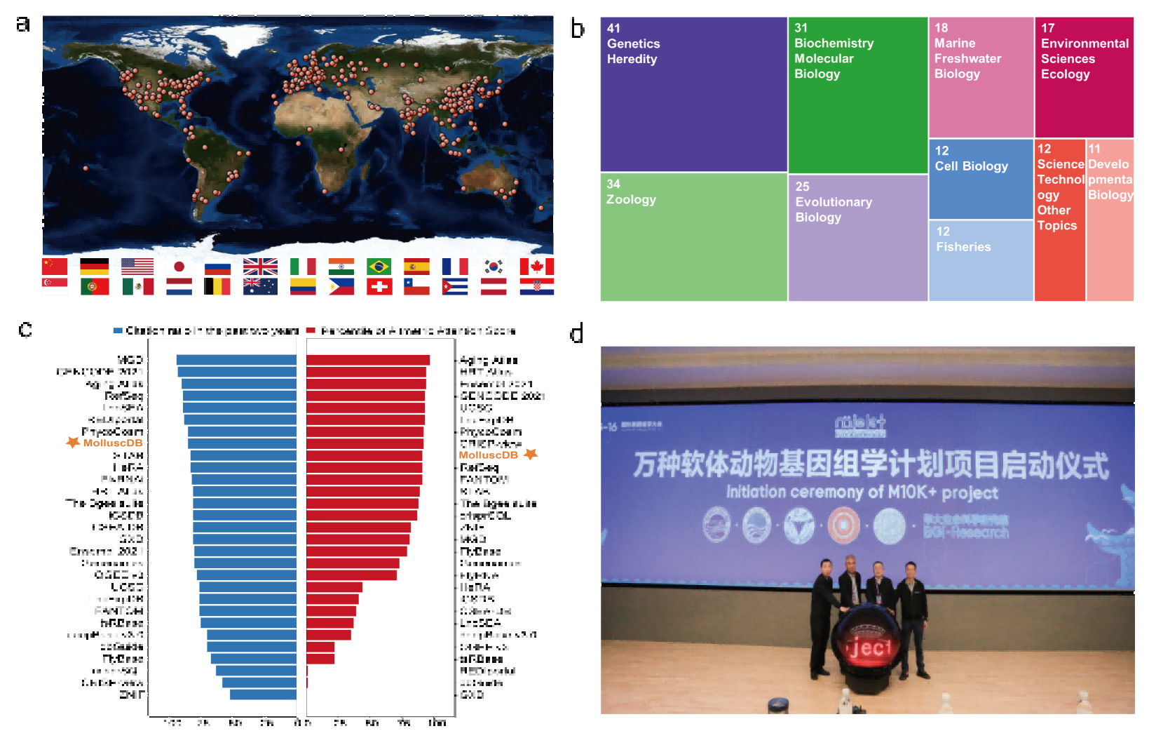 圖1-MolluscDB數(shù)據(jù)庫(kù)國(guó)際影響力(a: 訪問(wèn)國(guó)家;b: 引文領(lǐng)域;c: 數(shù)據(jù)庫(kù)排名;d: 國(guó)際M10K計(jì)劃啟動(dòng))