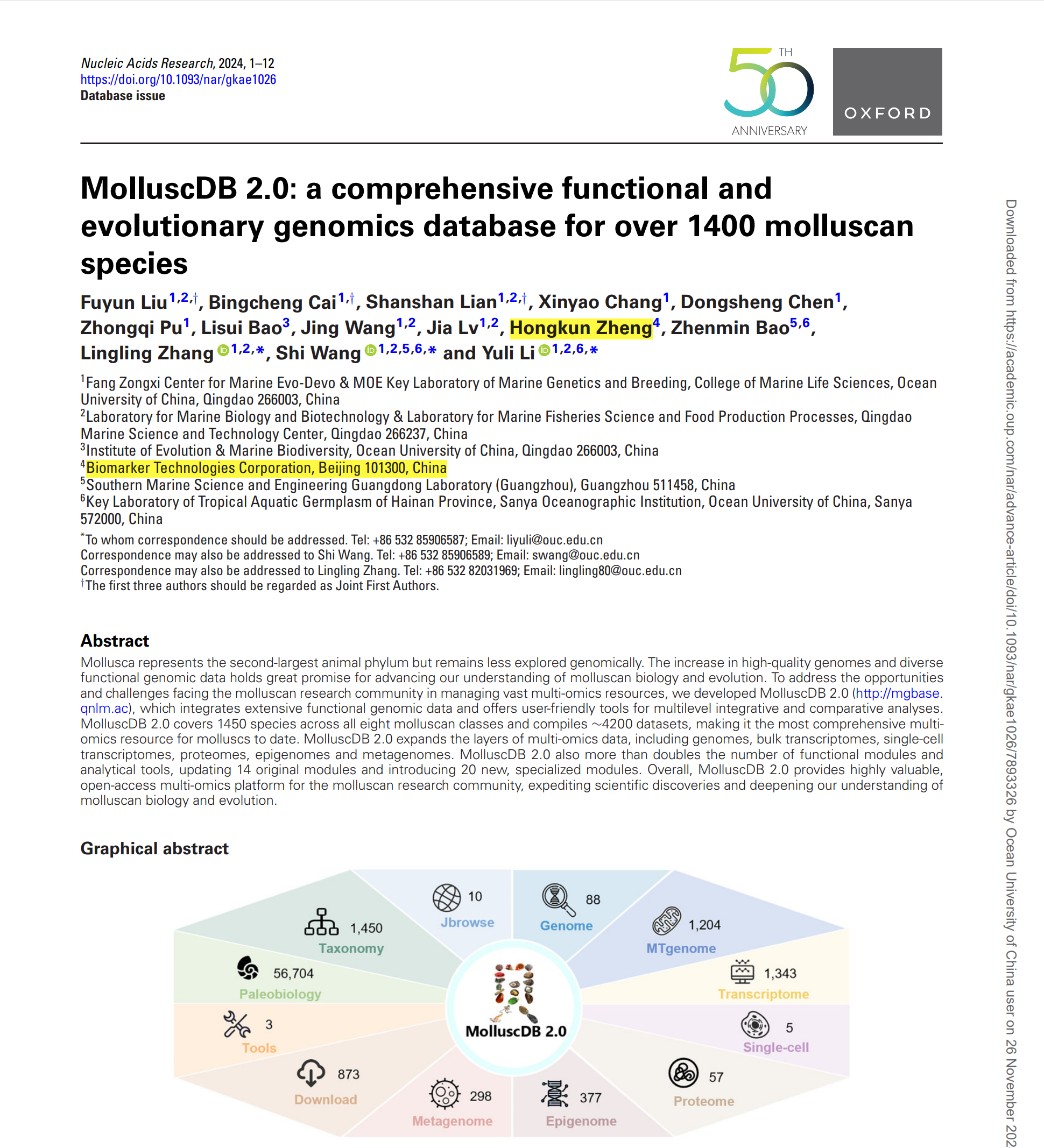 中國(guó)海洋大學(xué)“海洋生物遺傳學(xué)與育種”教育部重點(diǎn)實(shí)驗(yàn)室、方宗熙海洋生物進(jìn)化與發(fā)育中心包振民院士和王師教授團(tuán)隊(duì)在國(guó)際生物信息數(shù)據(jù)庫(kù)領(lǐng)域頂刊Nucleic Acids Research在線發(fā)表了軟體動(dòng)物功能和進(jìn)化基因組學(xué)綜合數(shù)據(jù)庫(kù)“MolluscDB 2.0: a comprehensive functional and evolutionary genomics database for over 1400 molluscan species”(MolluscDB 2.0:面向超過(guò)1400個(gè)軟體動(dòng)物種類(lèi)的功能和進(jìn)化基因組學(xué)綜合數(shù)據(jù)庫(kù))。