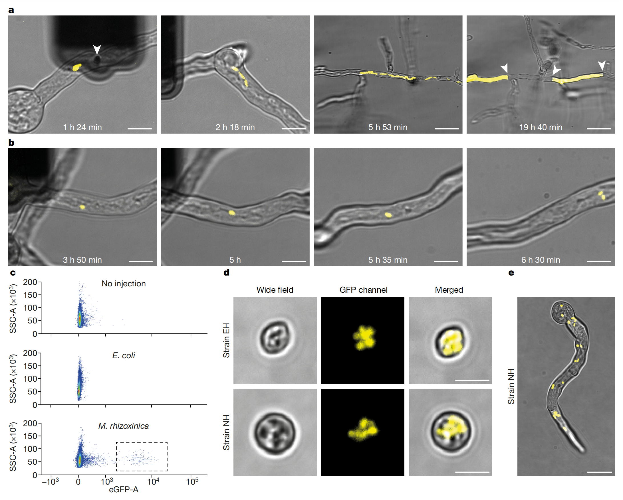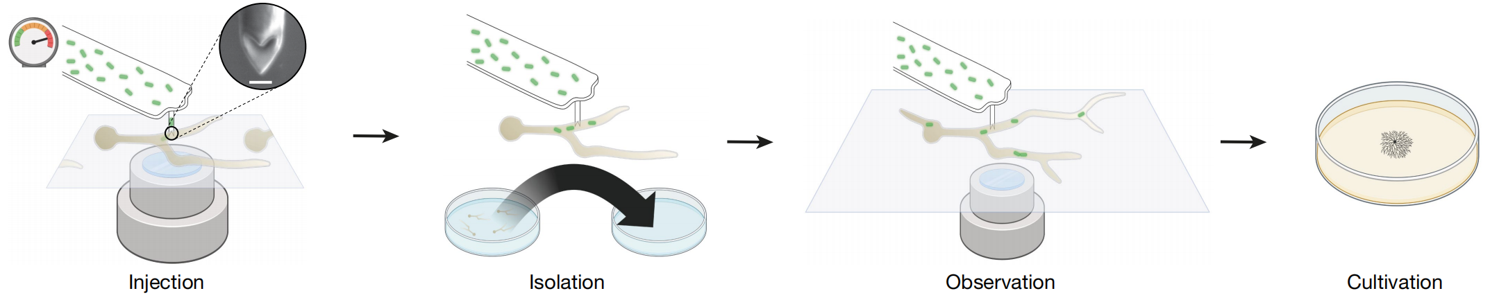 使用 FluidFM 技術,在不破壞真菌小孢根霉(R. microsporus)細胞的情況下將細菌植入其中,通過該技術,單次注射可將1-30個細菌注入R. microsporus內(nèi),同時可通過實時成像觀察人工誘導的內(nèi)共生現(xiàn)象的命運。用GFP標記的M. rhizoxinica注射入EH型絲狀真菌,細菌成功在絲狀真菌內(nèi)定殖并能垂直傳遞(遺傳),表明通過注射方法可以重建自然內(nèi)共生。
