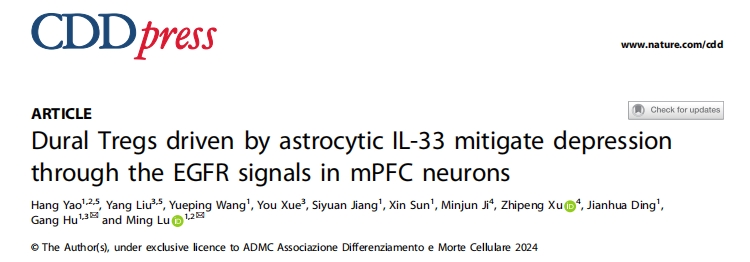 2024年11月,南京醫(yī)科大學(xué)基礎(chǔ)醫(yī)學(xué)院藥理學(xué)系魯明教授、胡剛教授團隊在Cell Death & Differentiation發(fā)表題為”Dural Tregs Driven by Astrocytic IL-33 Mitigate Depression Through the EGFR Signals in mPFC Neurons”的研究論文,使用單細胞轉(zhuǎn)錄組測序技術(shù)等多種技術(shù),深入闡述小鼠硬腦膜免疫細胞的抗抑郁機制,為抑郁癥治療提供了新的潛在治療靶點。接下來是本文的詳細解讀。