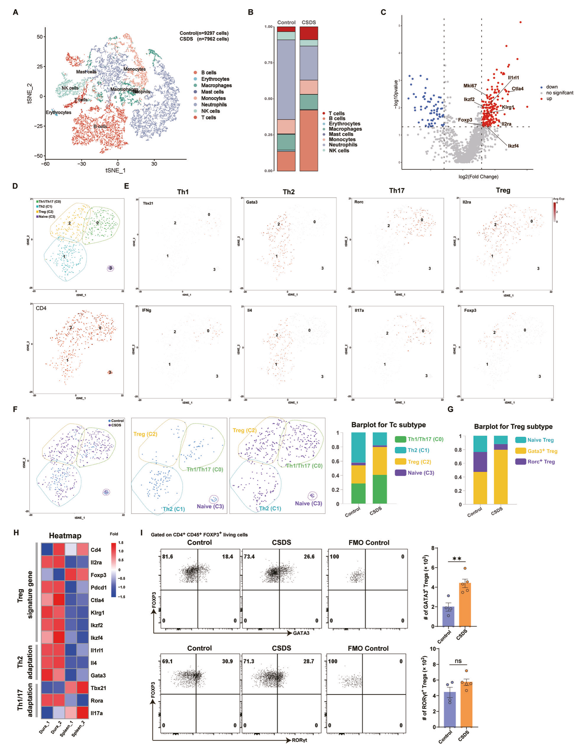 CSDS小鼠和對照組小鼠硬腦膜分選得到的免疫細胞進行scRNA-seq,結(jié)果顯示CSDS小鼠硬腦膜T細胞占比增加,其中Treg和Th17比例增加,Th2比例降低,初始T細胞沒有發(fā)生變化;Treg中,Gata3+?Treg比例提高,初始Treg和Rorx+?Treg比例降低。對照組小鼠硬腦膜和脾臟分選得到Treg進行SMART-seq,發(fā)現(xiàn)與脾臟相比,硬腦膜Treg的Gata3+亞型和Rora+亞型相關(guān)基因表達上調(diào)。流式細胞術(shù)進一步證實CSDS小鼠硬腦膜中GATA3+?Treg顯著增加,RORγt+?Treg數(shù)量無顯著變化。這些表明GATA3+ Treg可能參與抑郁表現(xiàn)的調(diào)控。