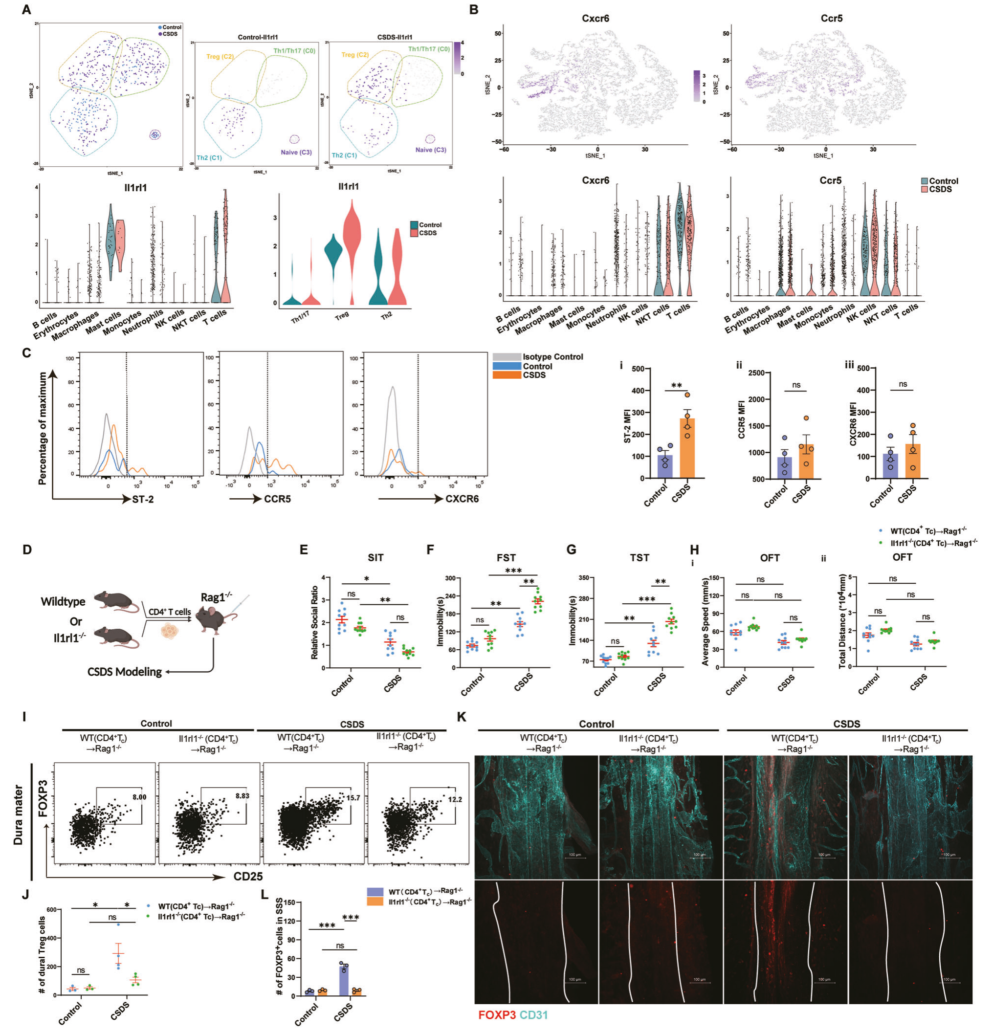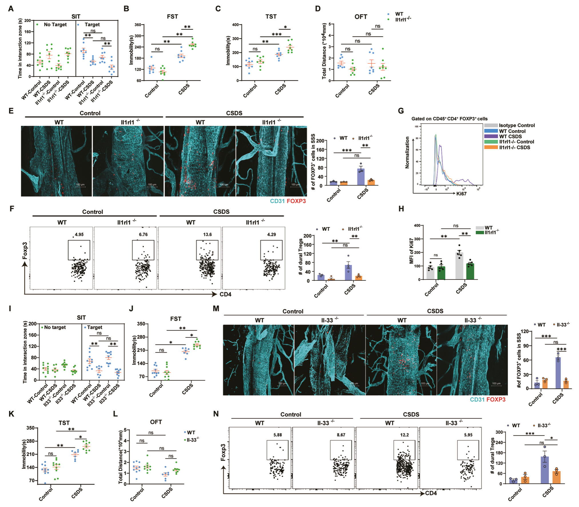 SMART-seq數(shù)據(jù)顯示CSDS小鼠硬腦膜“IL33結(jié)合”以及其他內(nèi)源性分子結(jié)合信號通路表達上調(diào);與脾臟相比,CSDS小鼠硬腦膜中表達ST2的細胞比例顯著高于脾臟;硬腦膜Treg富集趨化性通路。scRNA-seq數(shù)據(jù)也顯示CSDS小鼠模型中T淋巴細胞聚群高表達ST2編碼基因,且表達水平高于對照組小鼠的T淋巴細胞;CSDS小鼠模型硬腦膜Treg高表達ST2編碼基因。隨后,研究者將WT小鼠和Il1rl1-/-小鼠硬腦膜Treg細胞轉(zhuǎn)移到Rag1-/-小鼠并構(gòu)建CSDS模型,行為學(xué)等實驗結(jié)果證實,ST2表達是硬腦膜Treg招募和擴張所必須的。IL33-/-小鼠相關(guān)實驗也支持了IL33/ST2信號在抑郁期間促進硬腦膜Treg增殖。