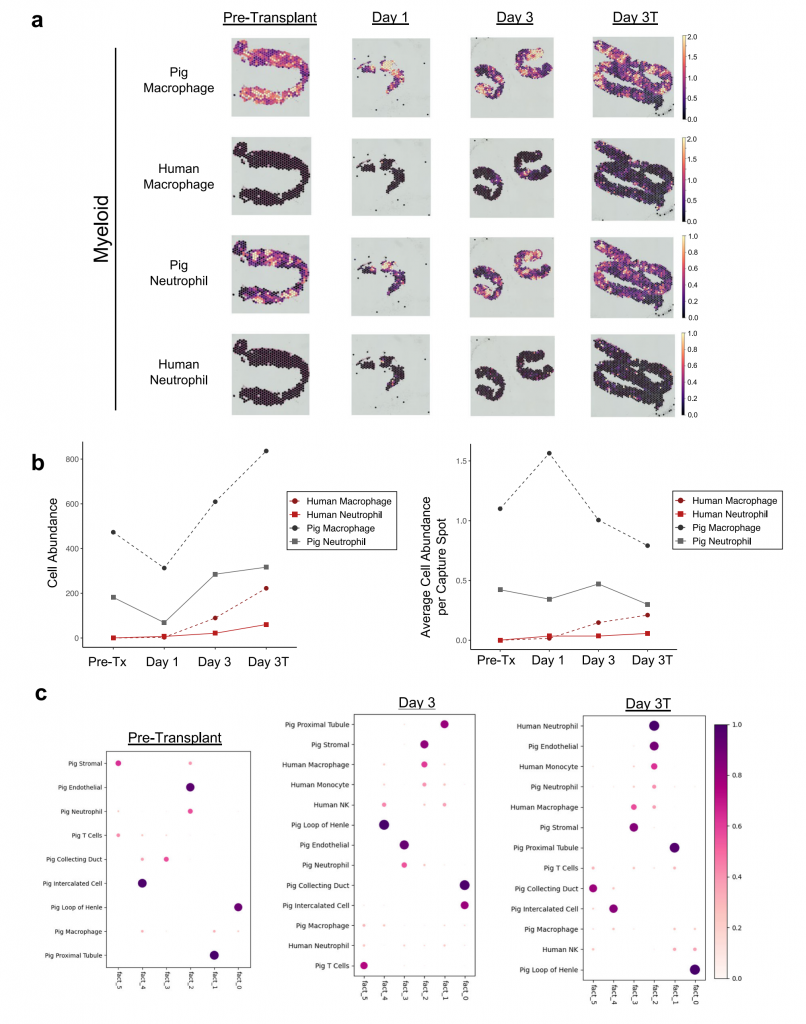② 移植后豬腎中髓系細(xì)胞是人和豬腎中檢測(cè)到的最多的免疫細(xì)胞,移植3天內(nèi)人B細(xì)胞和T淋巴細(xì)胞很少檢測(cè)到,3天后檢測(cè)到的人免疫細(xì)胞增多但豐度遠(yuǎn)小于豬免疫細(xì)胞。