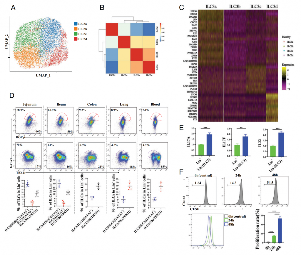 ① 單細(xì)胞數(shù)據(jù)分析顯示,豬腸道ILC(先天淋巴樣細(xì)胞)主要包括ILC3、ILC1、ILC2以及NC細(xì)胞,其中ILC3是豬空腸LPL(固有層淋巴細(xì)胞)中主要的ILC,進(jìn)一步分析揭示ILC3有4種亞群,但沒(méi)有在豬ILC中發(fā)現(xiàn)LTi(淋巴組織誘導(dǎo)細(xì)胞)。② 豬空腸ILC標(biāo)志基因與人基因相似,包括IL-23R、AHR、NCR2等。此外,研究者發(fā)現(xiàn)ILC3可能分化成ILC2、ILC1和NK細(xì)胞。ILC3亞群種,ILC3b沒(méi)有明顯高表達(dá)基因,是ILC亞群中具有更高轉(zhuǎn)分化可塑性的亞群,IKZF1和TGFB1可能與該過(guò)程有關(guān)。