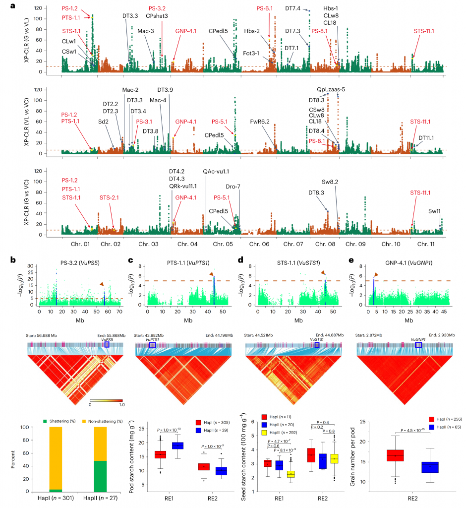 為了研究自然或人工選擇對(duì)豇豆分化的影響,作者通過選擇清除分析比較了三個(gè)豇豆亞群之間的基因組選擇特征,鑒定出239個(gè)與豇豆馴化和改良相關(guān)的基因。此外,通過GWAS,挖掘到裂莢性、莢長(zhǎng)、單莢粒數(shù)、千粒重、可溶性糖、總淀粉和粗蛋白質(zhì)含量相關(guān)基因,并在遺傳群體中驗(yàn)證。同時(shí)揭示了兩個(gè)亞種之間基因組結(jié)構(gòu)變異(SVs)的全圖譜,為豇豆在全基因組選擇下的馴化與改良提供了見解。產(chǎn)量性狀和品質(zhì)性狀的差異基因組選擇將有助于建立糧用豇豆和菜用豇豆雙向改良的遺傳資源。