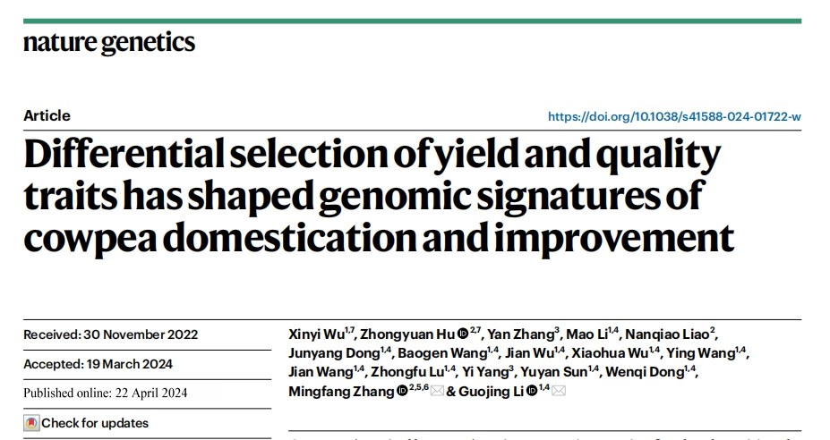 實(shí)驗(yàn)方法:菜用豇豆G98,糧用豇豆G323 基因組Denovo;重測(cè)序GWAS:344份全世界收集的豇豆核心種質(zhì),其中包括342份栽培豇豆(87份糧用豇豆、244份菜用豇豆和11份未知用途豇豆)和2份野生豇豆;Illumina測(cè)序,10x深度;基因單倍型驗(yàn)證:菜用豇豆地方品種 ‘ZN016’ 和菜用豇豆育成品種‘Zhijiang282構(gòu)建的RIL群體(183 lines)G98和G323構(gòu)建的F2群體(165 individuals)