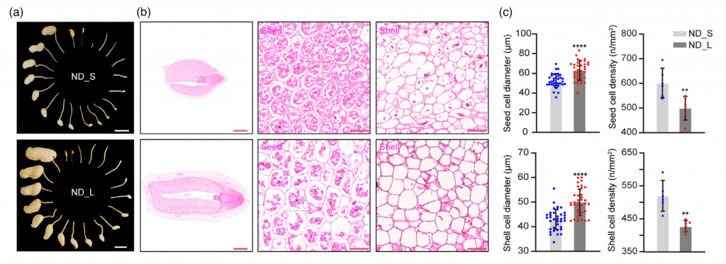 實(shí)驗(yàn)方法:莢果大小/重量差異顯著2份Virginia-type花生材料( ND _ L和ND _ S)雜交,產(chǎn)生遺傳群體;F2:3群體BSA-seq(20+20混池);F6:7 和F6:8群體精細(xì)定位;基因克??;系統(tǒng)進(jìn)化分析;亞細(xì)胞定位;免疫熒光;酵母雙雜交;pull-down;CO-IP;番茄擬南芥轉(zhuǎn)化實(shí)驗(yàn)等。