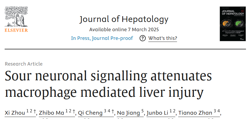 2025年3月,華中科技大學(xué)同濟(jì)醫(yī)學(xué)院附屬同濟(jì)醫(yī)院器官移植研究所蘭培祥教授、陳知水教授和肝臟外科程琪教授研究團(tuán)隊(duì)在Journal of Hepatology發(fā)表題為”Sour Neuronal Signalling Attenuates Macrophage Mediated Liver Injury”的研究論文。研究使用單細(xì)胞轉(zhuǎn)錄組測(cè)序技術(shù)等多種技術(shù),深入闡述人鼠中減輕肝缺血再灌注損傷的腦-肝軸調(diào)控通路,發(fā)現(xiàn)酸味刺激竟然可以通過神經(jīng)信號(hào)緩解肝臟損傷!這一發(fā)現(xiàn)不僅為肝臟疾病的治療提供了新思路,還從現(xiàn)代科學(xué)的角度驗(yàn)證了中醫(yī)“酸入肝”的理論。