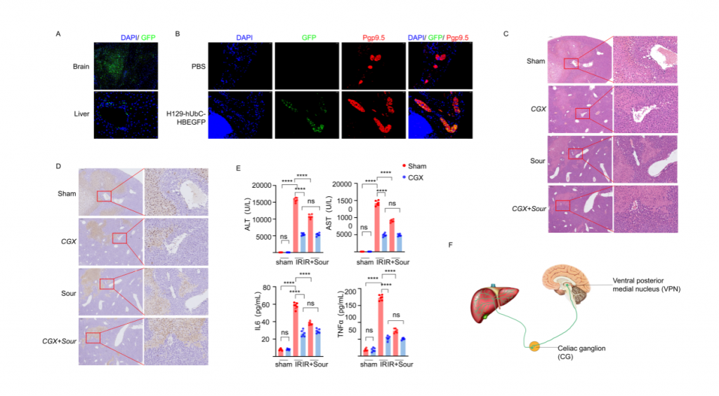 研究者首先構(gòu)建酸刺激下肝臟缺血再灌注損傷(IRI)小鼠模型,發(fā)現(xiàn)酸刺激可以減少肝組織損傷以及血清標(biāo)志物水平。但是,使用丁卡因局麻小鼠舌頭或者灌胃檸檬酸不能減少肝損傷和血清標(biāo)志物水平;NMDAR阻斷劑1(阻斷NMDAR介導(dǎo)的興奮性突觸傳遞)立體定位注射到腹后內(nèi)側(cè)核(VPN)后,酸刺激后IRI肝的血清標(biāo)志物水平和肝損傷程度無明顯變化,表明神經(jīng)系統(tǒng)在酸刺激減輕IRI過程中起重要作用。此外,小鼠VPN注射示蹤病毒的實(shí)驗(yàn)結(jié)果顯示,肝臟以及CG(腹腔神經(jīng)節(jié))均檢測(cè)到熒光,行腹腔神經(jīng)節(jié)切除術(shù)能降低IRI肝的組織損傷和血清標(biāo)志物水平,表明酸刺激減輕肝損傷過程通過腦-CG-肝軸。