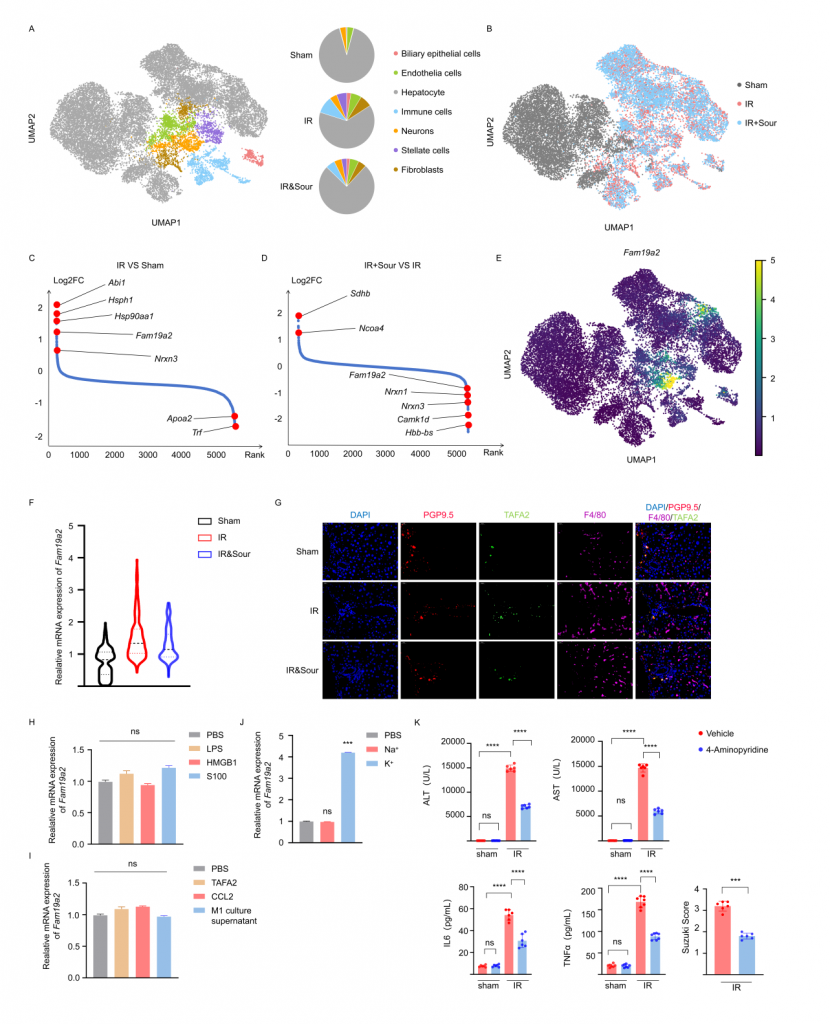 對(duì)肝IRI小鼠、酸刺激后肝IRI小鼠及sham(假手術(shù))小鼠的肝臟和CG進(jìn)行單細(xì)胞核轉(zhuǎn)錄組測(cè)序,結(jié)果顯示IRI引起肝細(xì)胞和神經(jīng)元基因表達(dá)譜發(fā)生變化,IRI肝中免疫細(xì)胞數(shù)量增加,但酸刺激后IRI樣本中免疫細(xì)胞數(shù)量減少。神經(jīng)元較為特異性地表達(dá)TAFA2,IRI可引起肝神經(jīng)元TAFA2表達(dá)水平增加,但酸刺激使得TAFA2表達(dá)水平降到與sham對(duì)照組相近水平。實(shí)驗(yàn)發(fā)現(xiàn)鉀離子可引起小鼠海馬神經(jīng)元細(xì)胞系HT22顯著高表達(dá)TAFA2,使用鉀離子通道抑制劑可減輕肝損傷,支持酸刺激通過神經(jīng)系統(tǒng)減輕肝損傷的假設(shè)。進(jìn)一步的,使用慢病毒敲低神經(jīng)元TAFA2表達(dá)水平或使用TAFA2敲基因鼠,發(fā)現(xiàn)IRI引起的肝組織損傷、巨噬細(xì)胞浸潤(rùn)以及血清標(biāo)志物水平降低,表明TAFA2在肝IRI中有著重要作用。