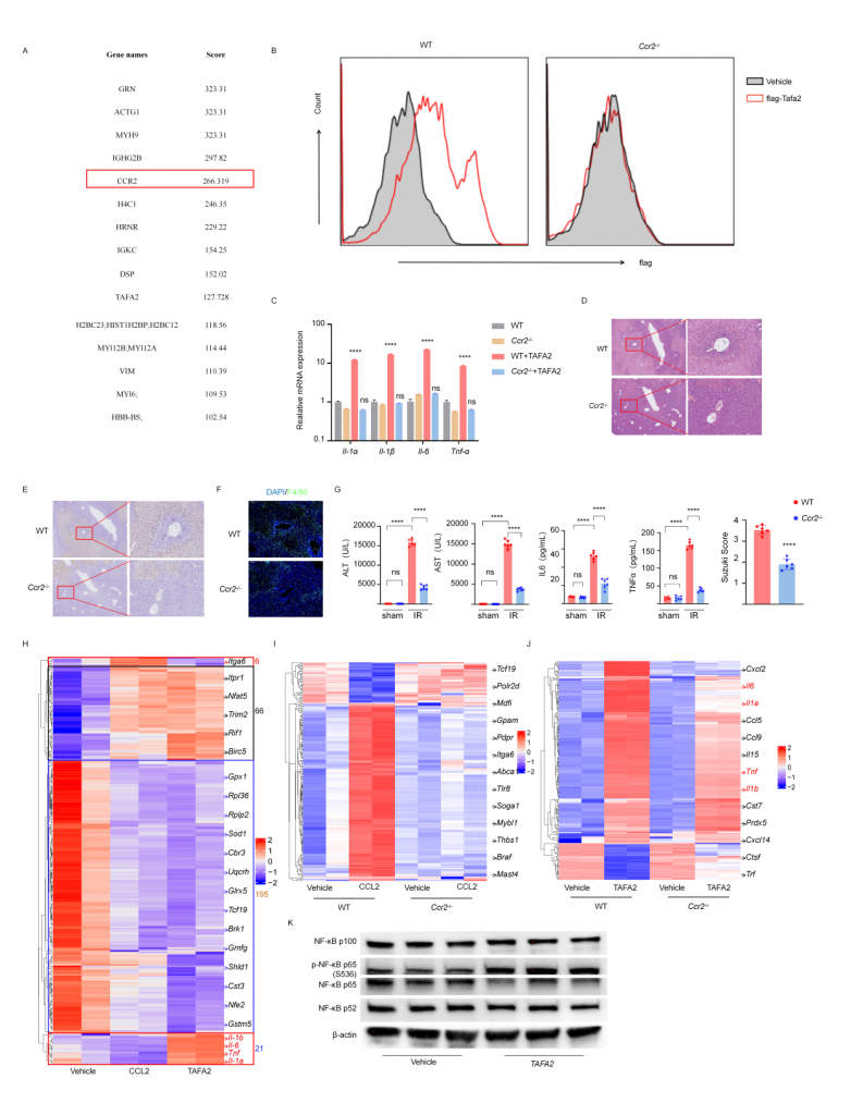 體外實(shí)驗(yàn)表明巨噬細(xì)胞上的CCR2是TAFA2受體,CCR2敲除小鼠IRI肝的組織損傷以及巨噬細(xì)胞浸潤(rùn)降低,血清標(biāo)志物水平降低。TAFA2或CCL2刺激后BMDM的bulk RNA-seq數(shù)據(jù)表現(xiàn)出幾乎一致的轉(zhuǎn)錄組表達(dá)譜,粘附、代謝、Ras信號(hào)通路相關(guān)差異基因表達(dá)上調(diào),代謝和核糖體通路相關(guān)基因表達(dá)下調(diào),TAFA2誘導(dǎo)BMDM更高的表達(dá)Il1α,Il1β,Il6,Tnfα以及干擾素相關(guān)基因,促進(jìn)巨噬細(xì)胞介導(dǎo)的炎癥響應(yīng)。進(jìn)一步實(shí)驗(yàn)表明TAFA2促使巨噬細(xì)胞介導(dǎo)的炎癥響應(yīng)主要依賴CCR2,但巨噬細(xì)胞上也可能存在其他的TAFA2受體。