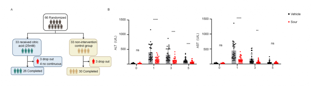 為了確認(rèn)酸刺激在人類肝IRI中的作用,研究者進(jìn)行了開放、隨機(jī)、空白對(duì)照臨床試驗(yàn)(ChiCTR2400088096),包含多種良性/惡性肝腫瘤、肝外傷、膿腫、囊腫和包蟲病,由于手術(shù)期間門靜脈短暫阻斷以減少肝切除過程中出血,導(dǎo)致肝出現(xiàn)缺血再灌注損傷。干預(yù)組33名患者,術(shù)前24h開始,每8h給與新鮮的25mM檸檬酸(持續(xù)5min),對(duì)照組33名患者不接受酸刺激,剔除6名術(shù)中肝缺血超過30min患者以及4名依從性差患者,肝切除術(shù)后第1/3/5天對(duì)患者肝功能進(jìn)行評(píng)估,結(jié)果顯示酸刺激組血清ALT和AST水平顯著低于對(duì)照組,高ALT水平(>500 U/L)患者數(shù)量也顯著更低,這些結(jié)果表明酸刺激可減輕人類肝切除術(shù)引起的肝IRI。