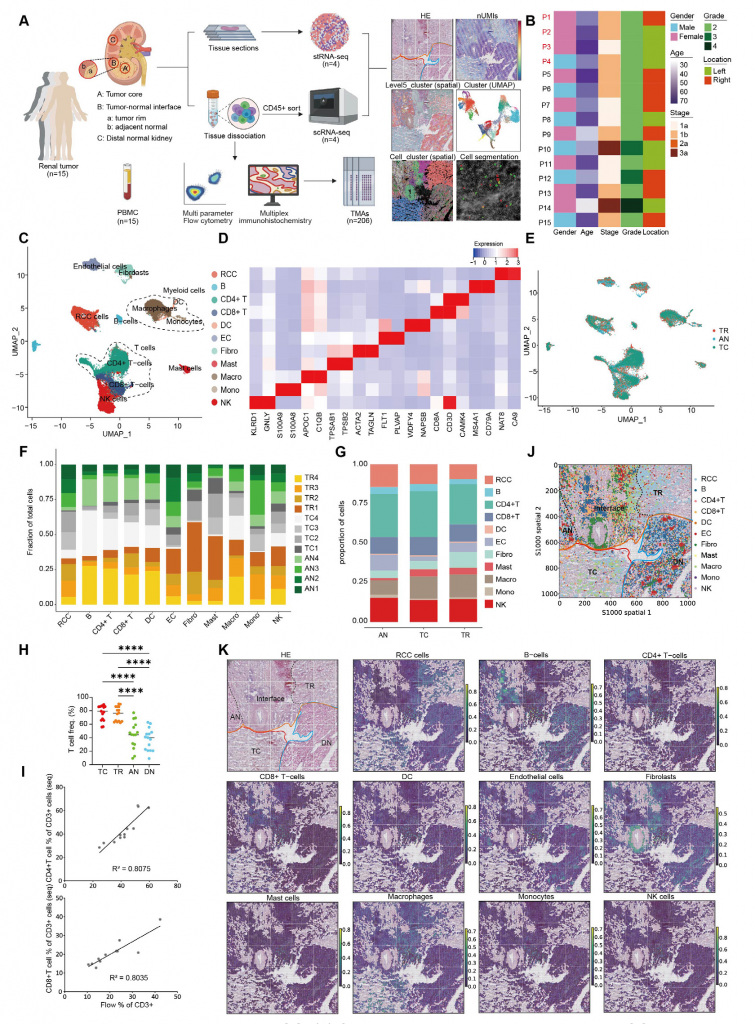 研究材料:15名腎切除術(shù)的ccRCC患者組織樣本及其血液PBMC。對組織樣本區(qū)域進行定義,分為腫瘤核心(TC),腫瘤-健康交界(IF,包括腫瘤邊緣TR和臨近健康腎組織AN),遠(yuǎn)端健康腎組織DN。