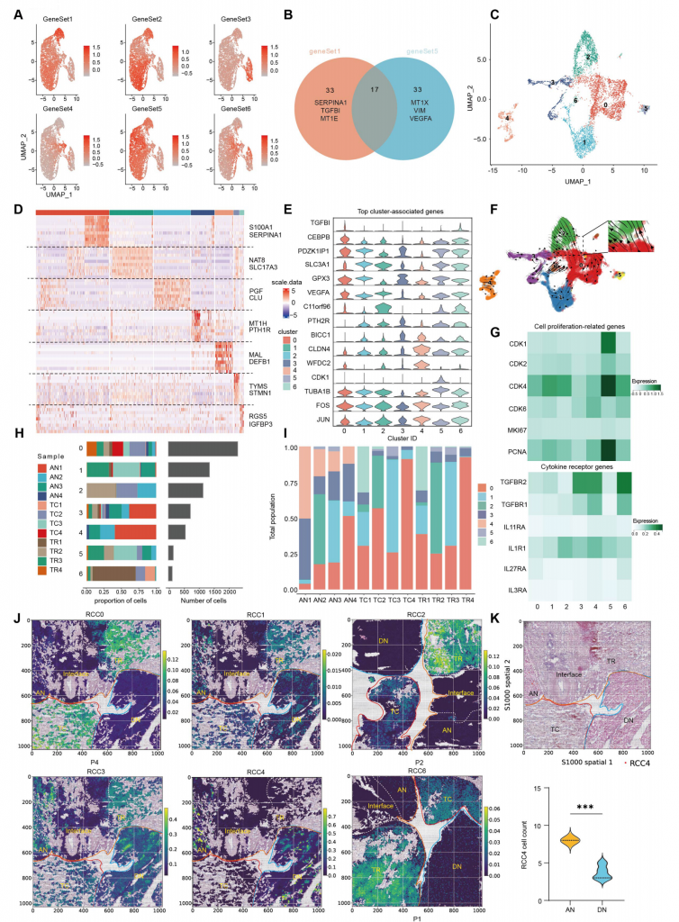進一步分析,發(fā)現(xiàn)ccRCC亞群0~4簇與不同基因集表達譜匹配,5和6簇不與任何基因集匹配但具有細(xì)胞周期和應(yīng)激響應(yīng)相關(guān)基因表達。RCC0簇和RCC2簇代表EMThigh腫瘤細(xì)胞并在IF區(qū)域富集,RCC1簇代表PT(近曲小管)細(xì)胞,擬時序分析結(jié)果顯示存在RCC0—>RCC2分化關(guān)系,但RCC2幾乎只在P2患者樣本中發(fā)現(xiàn),表明RCC2可能與個別患者特征相關(guān)。RCC1、RCC3和RCC4細(xì)胞主要在組織而不是腫瘤區(qū)域富集,RCC4主要分布在AN和DN區(qū)域,RCC4在AN區(qū)域分布數(shù)量高于DN區(qū)域。RCC4高表達細(xì)胞因子受體基因,表明TME中分泌的促腫瘤細(xì)胞因子可能傾向于作用到RCC4,增加其轉(zhuǎn)變成癌細(xì)胞的概率,加速腫瘤逃逸,促進腫瘤惡性化,與以往瘤旁附近不是完全的健康組織認(rèn)識相符合。