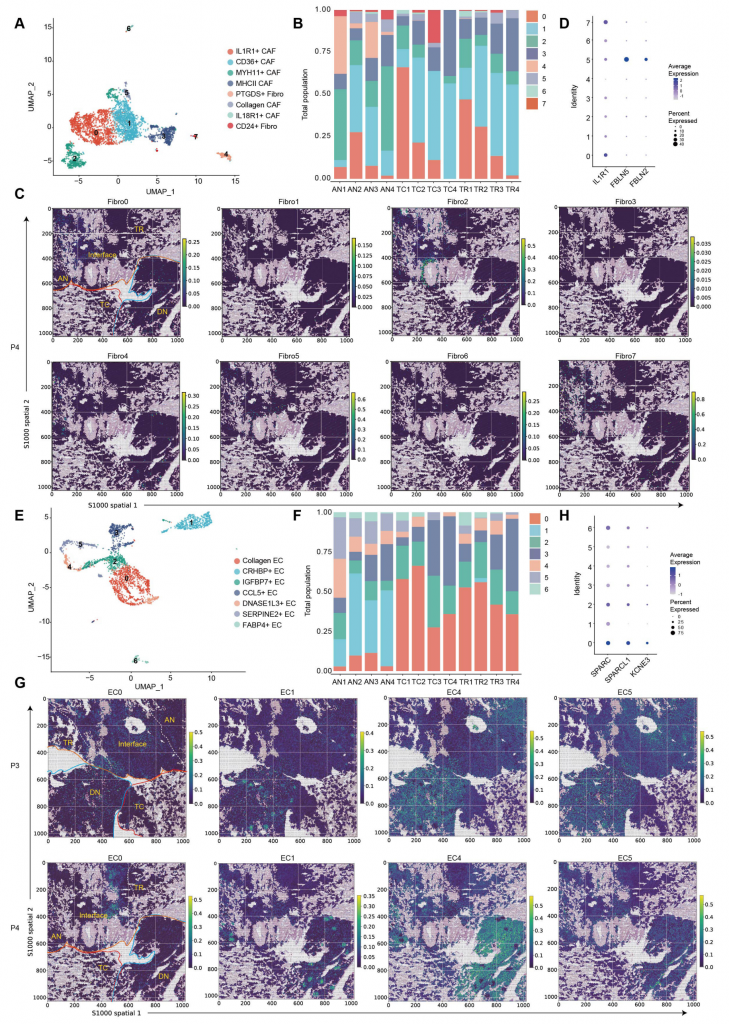 scRNA-seq與空間數(shù)據(jù)均顯示,ccRCC存在8種激活的成纖維細(xì)胞簇,腫瘤區(qū)域成纖維細(xì)胞數(shù)量高于健康組織,其中CD24+IL32+成纖維細(xì)胞顯著富集在腫瘤區(qū)域,PTGDS+成纖維細(xì)胞幾乎全分布在AN,高表達ECM(胞外基質(zhì))形成和EMT的成纖維細(xì)胞簇在IF較為富集,IL1R1+?CAF(腫瘤相關(guān)成纖維細(xì)胞)表現(xiàn)出腫瘤促進表型;7種EC(內(nèi)皮細(xì)胞)簇中4種(0,2,3和6)主要富集在腫瘤組織,3種(1,4和5)在健康組織富集,膠原蛋白EC(0簇)豐度最高,具有促腫瘤特征。總之,不同的ECM蛋白質(zhì)產(chǎn)生基質(zhì)細(xì)胞傾向于富集在IF并共定位,可能行駛多種功能,包括細(xì)胞-細(xì)胞交互和胞外組分重構(gòu)。