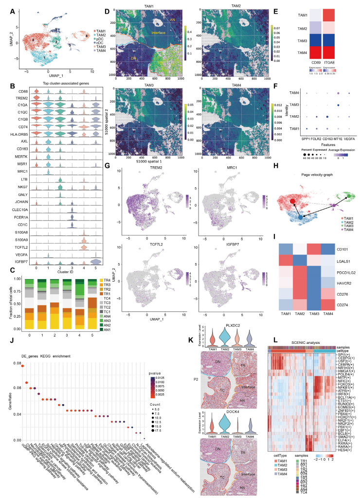 scRNA-seq數(shù)據(jù)與空間數(shù)據(jù)均顯示,4種TAM簇具有不同分布趨勢,TAM1主要分布在TC區(qū)域;TAM2高表達FOLR2、MRC1和CD163,可能是M2樣巨噬細(xì)胞且具有增強的免疫抑制特征,TAM4是組織駐留巨噬細(xì)胞,兩者主要分布在TR區(qū)域;TAM3表達炎癥響應(yīng)相關(guān)基因,在TR和AN區(qū)域富集。RNA速率分析顯示存在TAM4—>TAM2—>TAM1和TAM4—>TAM3兩種軌跡,以及從IF區(qū)域遷移到TC區(qū)域的趨勢。進一步的功能分析顯示,IF區(qū)域的TAM2可能通過促進EMT,TC區(qū)域的TAM2可能通過促進腫瘤血管生成,起到促癌效應(yīng)??傊?strong>TAM2不同的腫瘤促進效應(yīng)可能與免疫抑制TME有關(guān)。