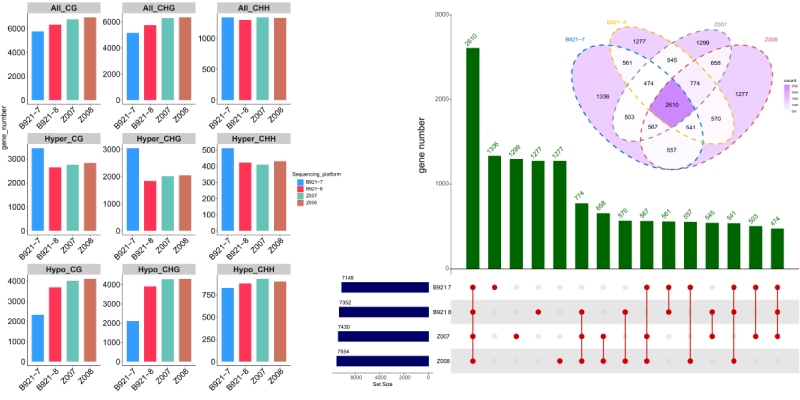 甲基化DMR分析結(jié)果顯示,SURFseq 5000 測序數(shù)據(jù)(Z007及Z008)鑒定DMR數(shù)要多于Nova X plus測序同批數(shù)據(jù)(B921-7及B921-8),且根據(jù)韋恩圖統(tǒng)計結(jié)果來看,SURFseq 5000 測序兩個重復(fù)樣本重合的DMR較Nova X plus測序的兩重復(fù)樣本更多,測序結(jié)果一致性更好。實測數(shù)據(jù)顯示:SURFseq能夠完美復(fù)刻甚至優(yōu)于國際主流平臺的數(shù)據(jù)質(zhì)量。