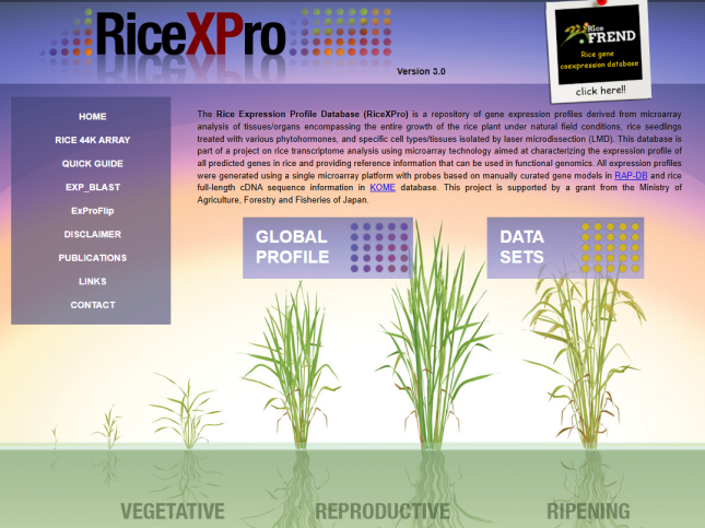 ☆?水稻表達譜數(shù)據(jù)庫RiceXPro:針對水稻植物在自然田間條件下的整個生長過程、用各種植物激素處理的水稻幼苗以及通過激光顯微切割(LMD) 分離的特定細胞類型/組織,使用微陣列技術進行水稻轉錄組分析,旨在表征水稻中所有預測基因的表達譜。