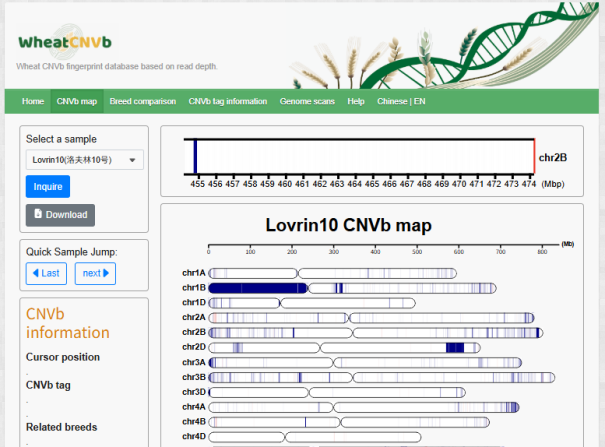 ☆?小麥WheatCNVb數(shù)據(jù)庫:基于小麥CNVb新型分子標記系統(tǒng),支持查詢小麥種質資源的CNVb標記,可視化CNVb指紋,并進行基于CNVb指紋的品種比較。